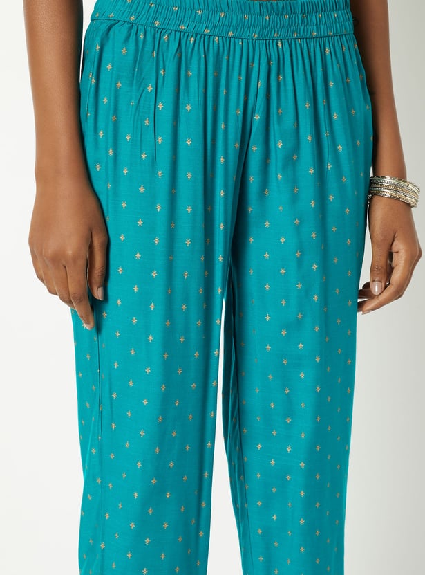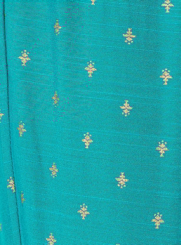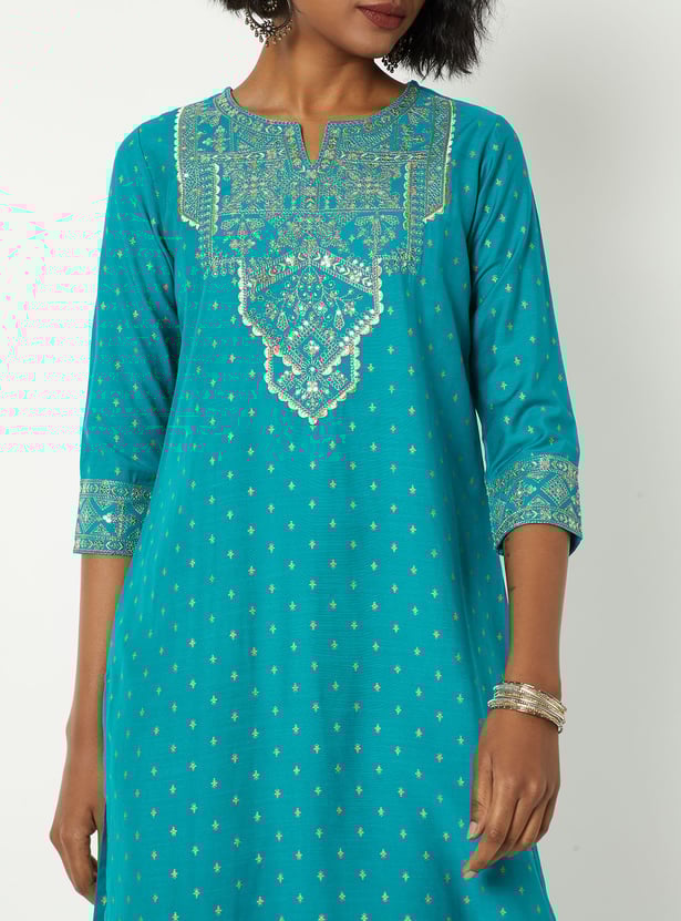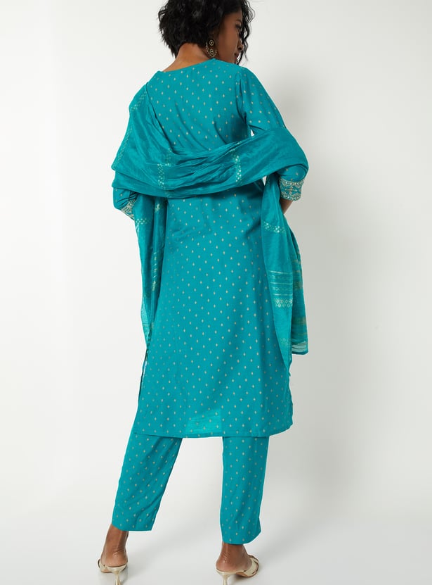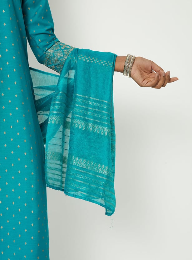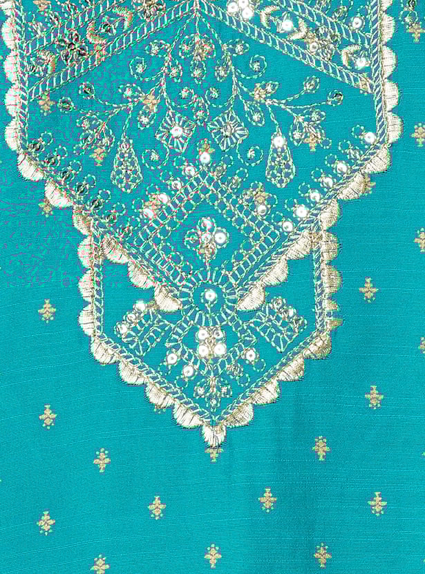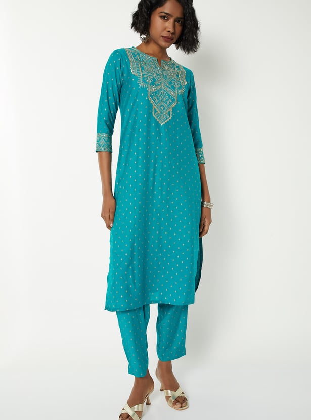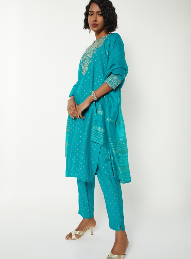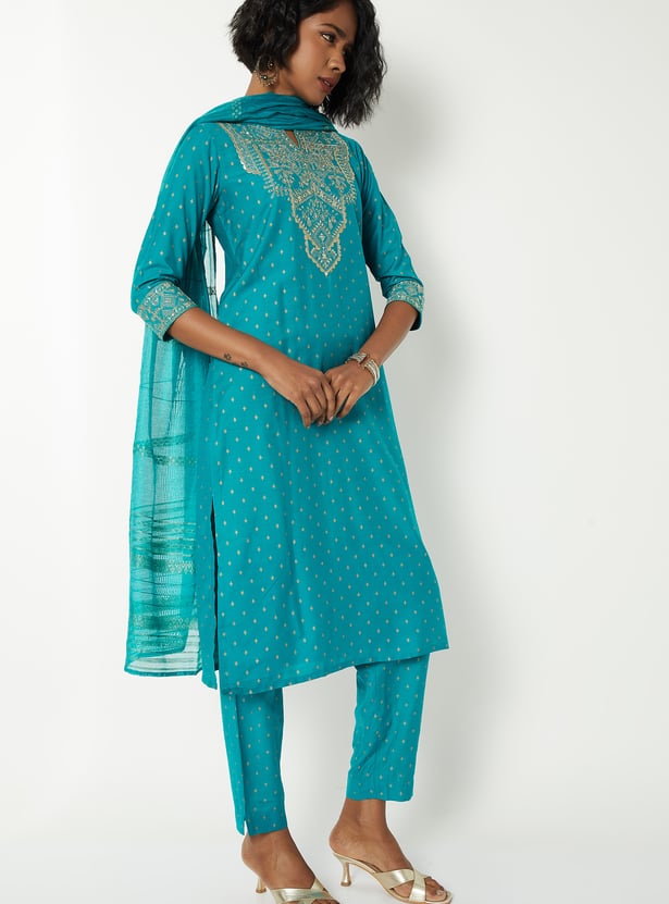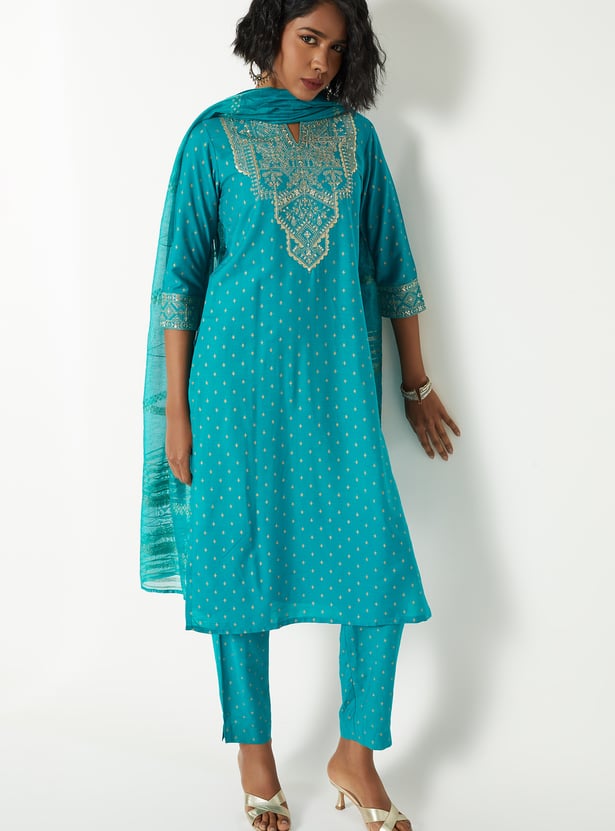 This elegant embroidered kurta set features a notched neck with a V-slit and 3/4th sleeves. It is paired with matching bottoms and a dupatta, and includes a convenient side pocket for everyday ease. An excellent pick for special occasions and festivities.