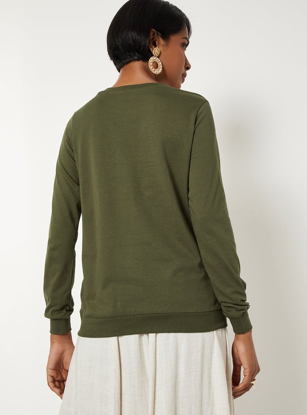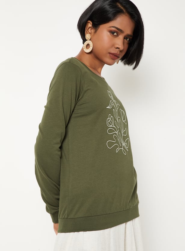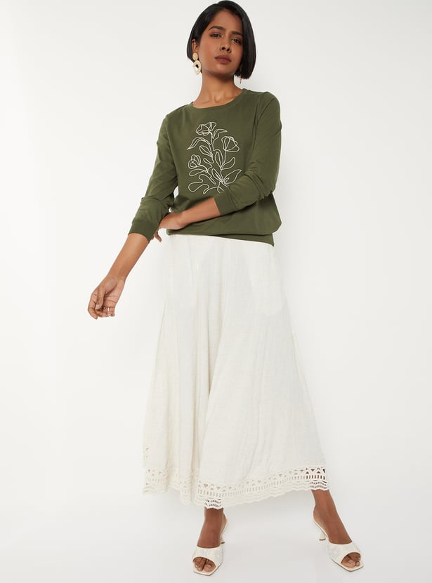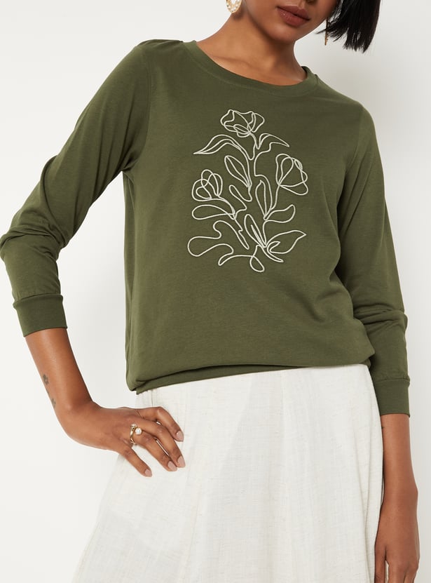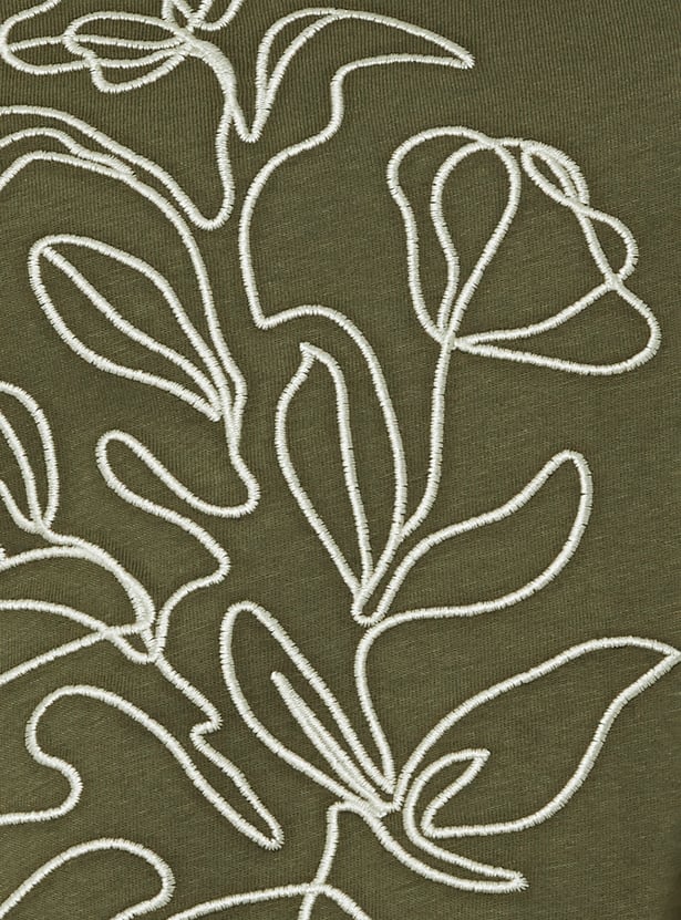 Casual and stylish, this embroidered T-shirt is designed with a round neck and full sleeves. The embroidery adds an elegant touch while the longer sleeves make it versatile for layering or cooler days.