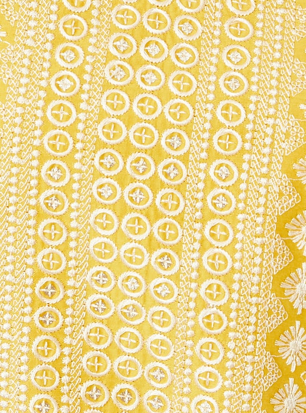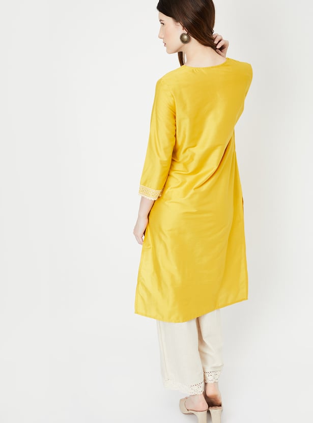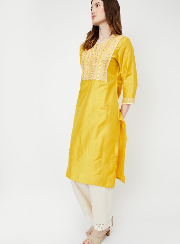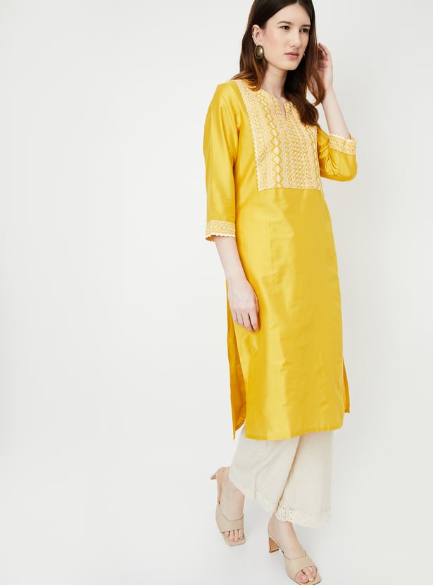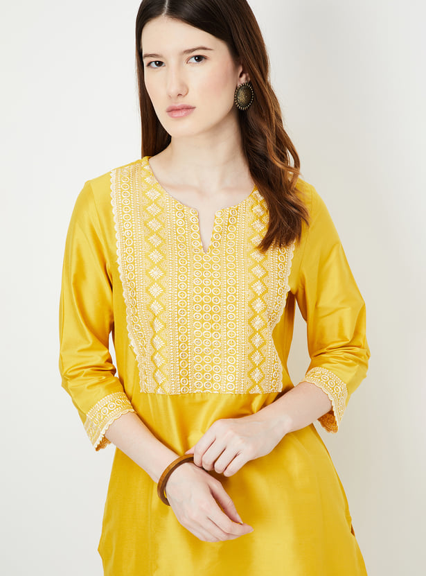 Flaunt a look of elegance in this straight kurta. It features a notched neck, three-quarter sleeves, and intricate embroidery at the yoke and cuffs. With a convenient pocket and a flattering calf-length cut, this kurta combines style and sophistication effortlessly.
