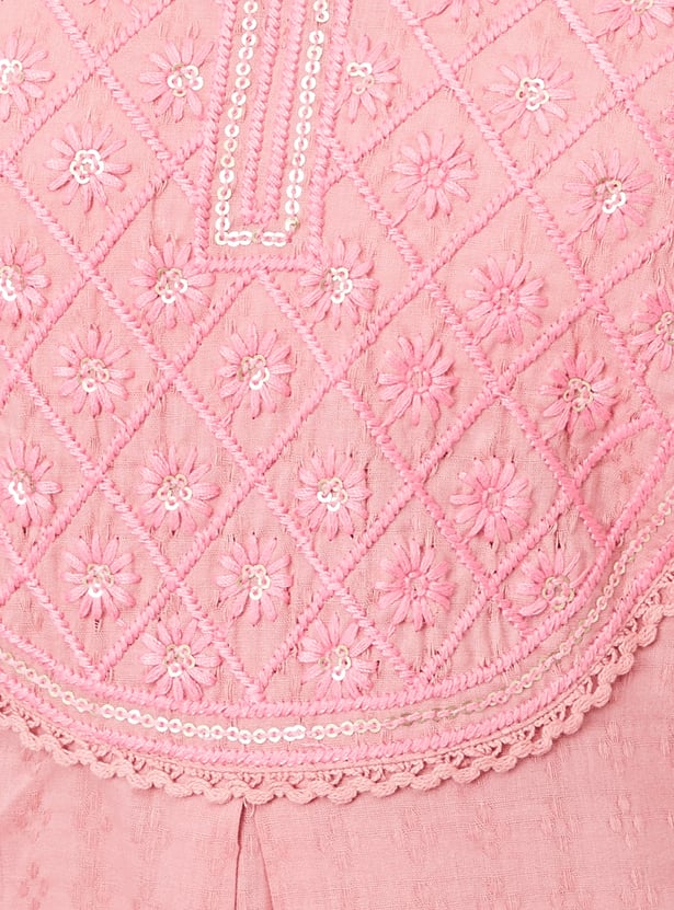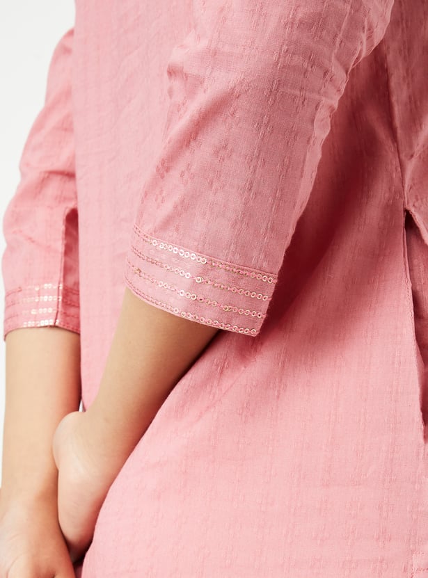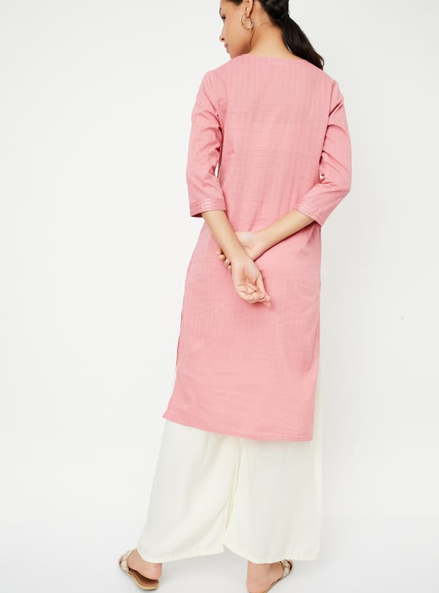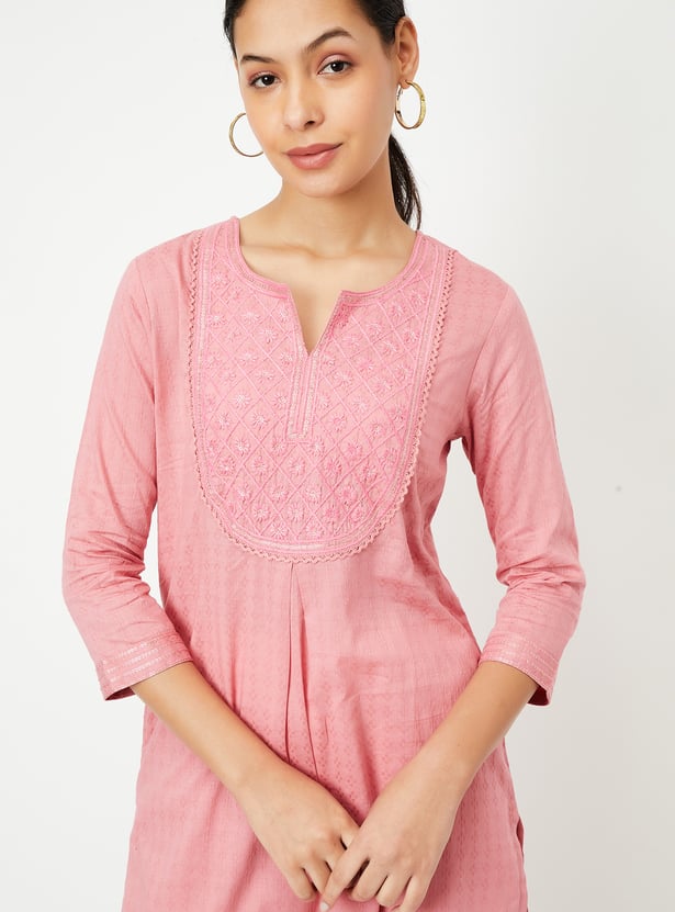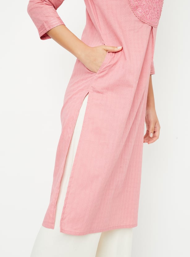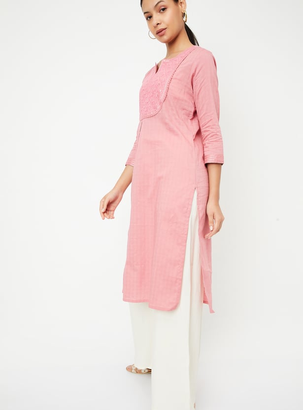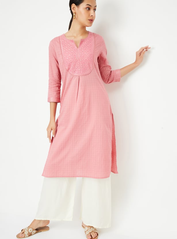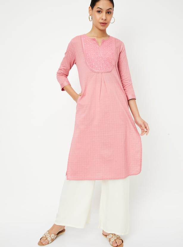 Flaunt an elegant look in this straight kurta, featuring a woven surface, notched neckline, and three-quarter sleeves. The intricate embroidery on the yoke and cuffs adds a refined touch, while the added pocket offers both style and convenience.