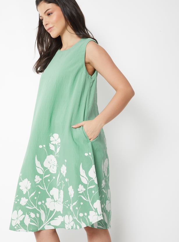 Add effortless charm to your wardrobe with this sleeveless A-line dress designed for easy style. Featuring a round neck, floral prints, pockets, and a flowy silhouette for comfortable everyday wear.