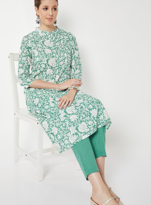 Elevate your ethnic wardrobe with this printed straight kurta set, designed for comfort and elegance. The kurta features a band collar, button closure, and 3/4th sleeves, offering a refined silhouette with practical detailing. It is paired with straight pants that have an elasticated waist, ensuring ease of movement and a relaxed fit.