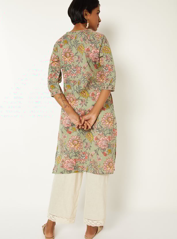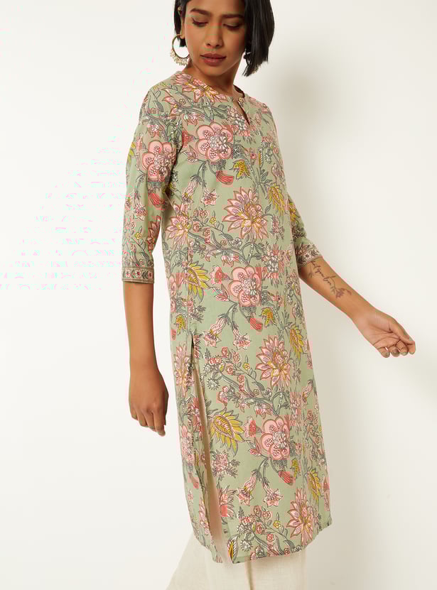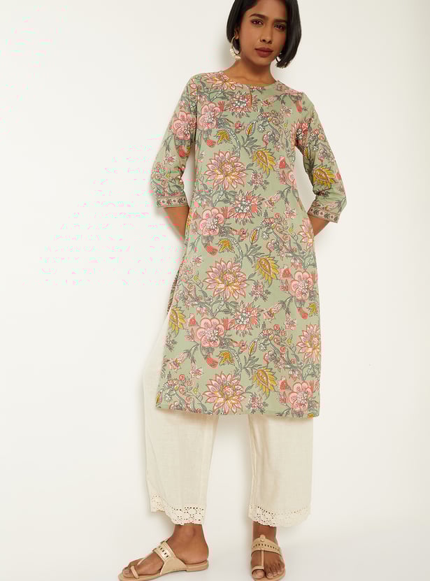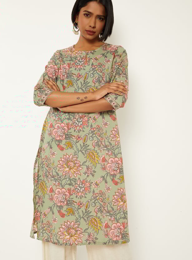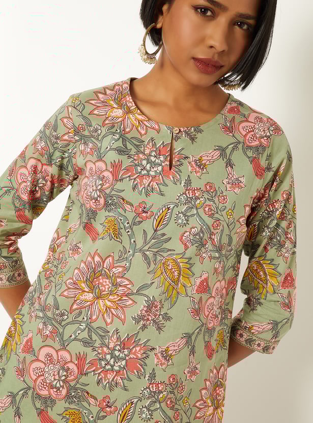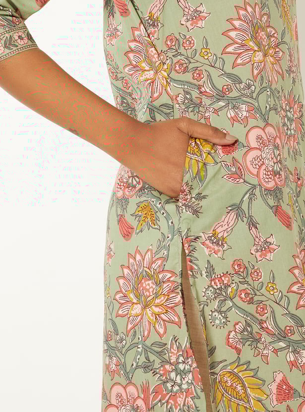 Elegant and effortless, this straight kurta set is perfect for an everyday ethnic look. Designed with a straight-cut silhouette and finished with all-over floral prints, it comes with a keyhole neck and 3/4th sleeves. The side pocket adds to the functionality.