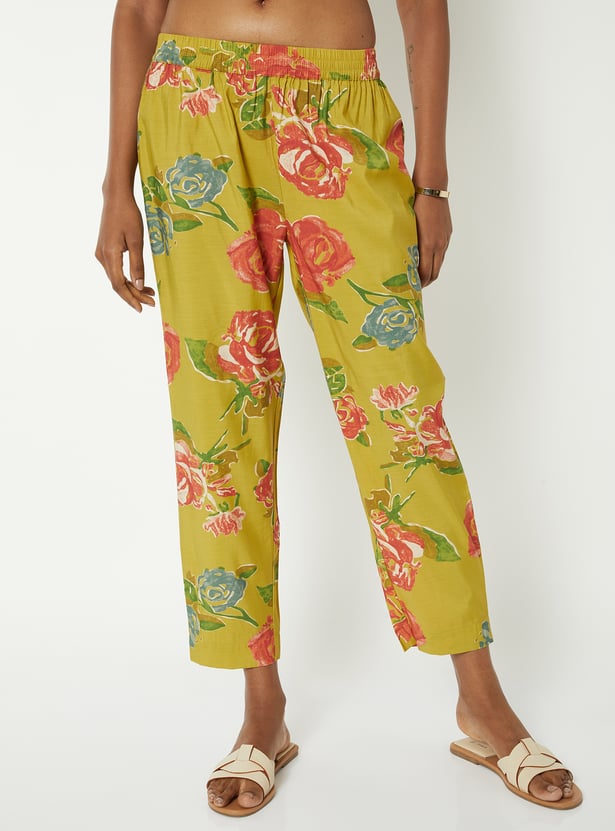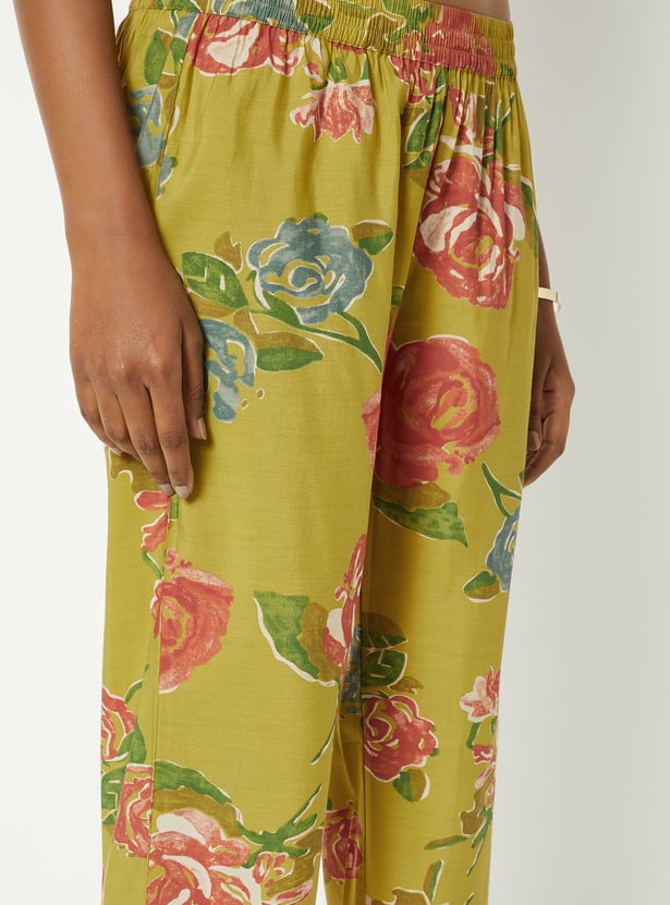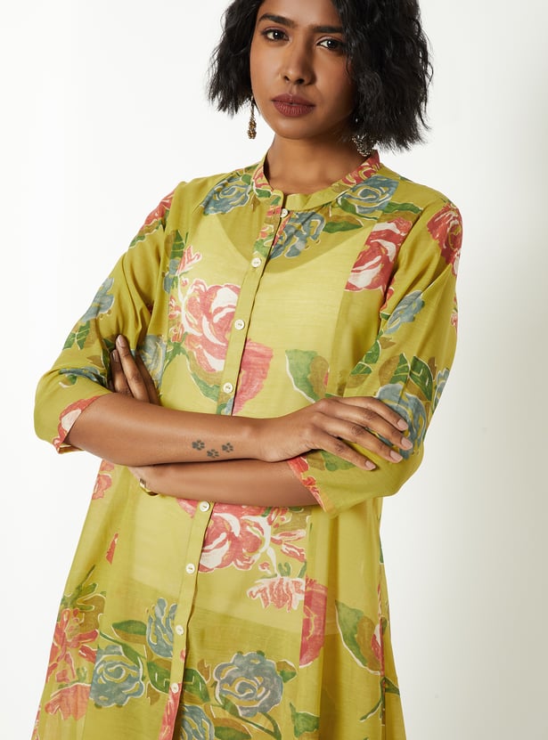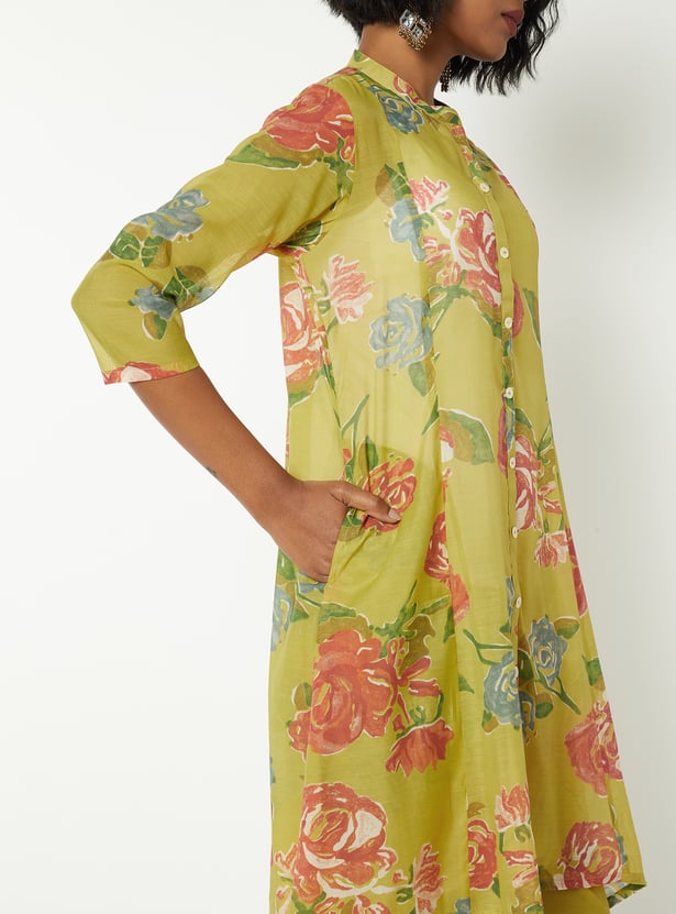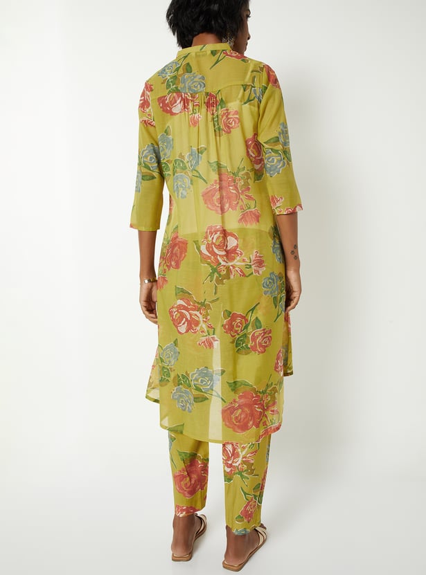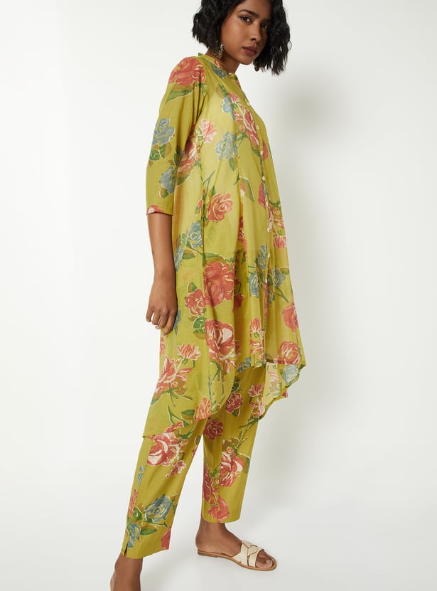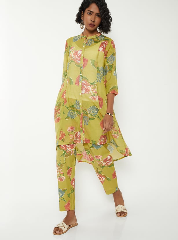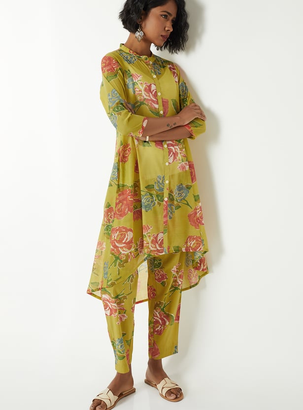 Elevate everyday elegance with this floral print A-line kurta set with kurta featuring a band collar, button closure, 3/4th sleeves, a chic high–low hemline, and handy side pockets. It is paired with straight pants designed with an elasticated waist for all-day comfort.