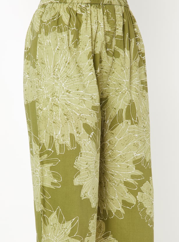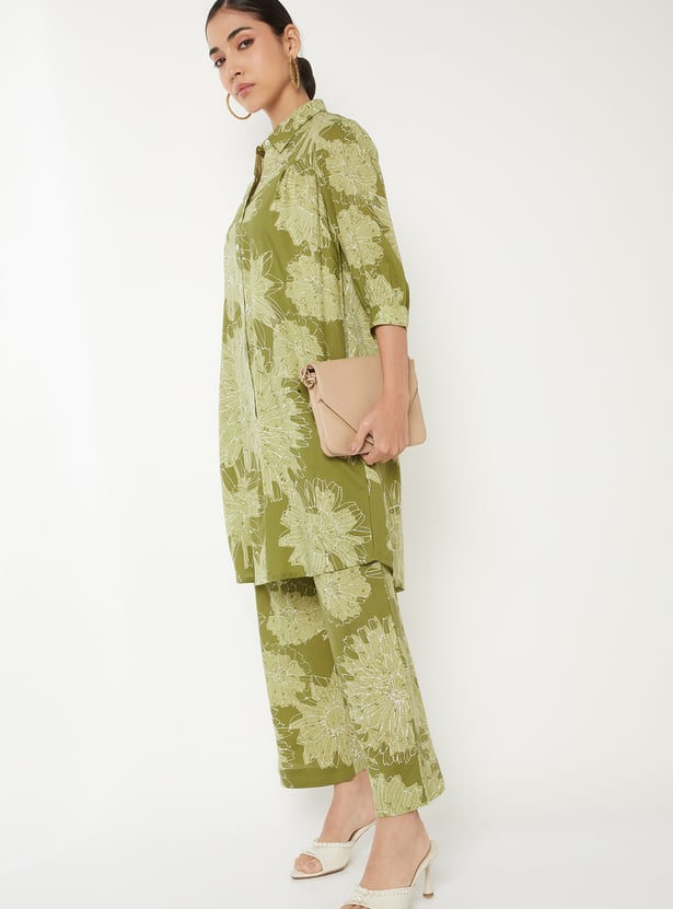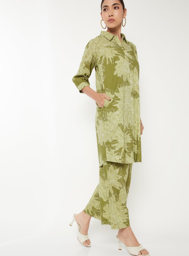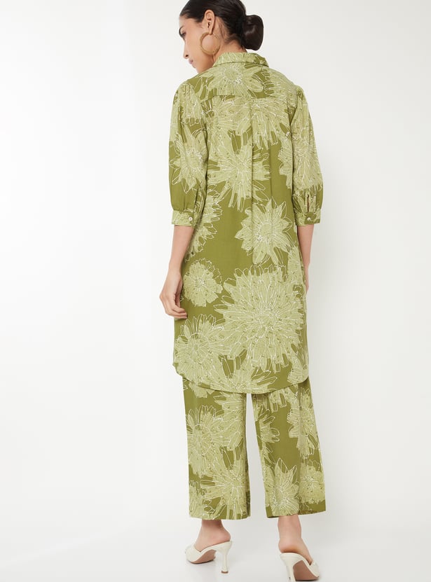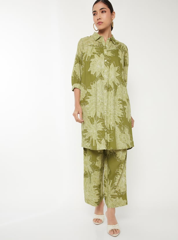 Designed with three-quarter length sleeves, a spread collar, and a knee-length silhouette, this floral print kurta is complemented by a pair of palazzo pants.