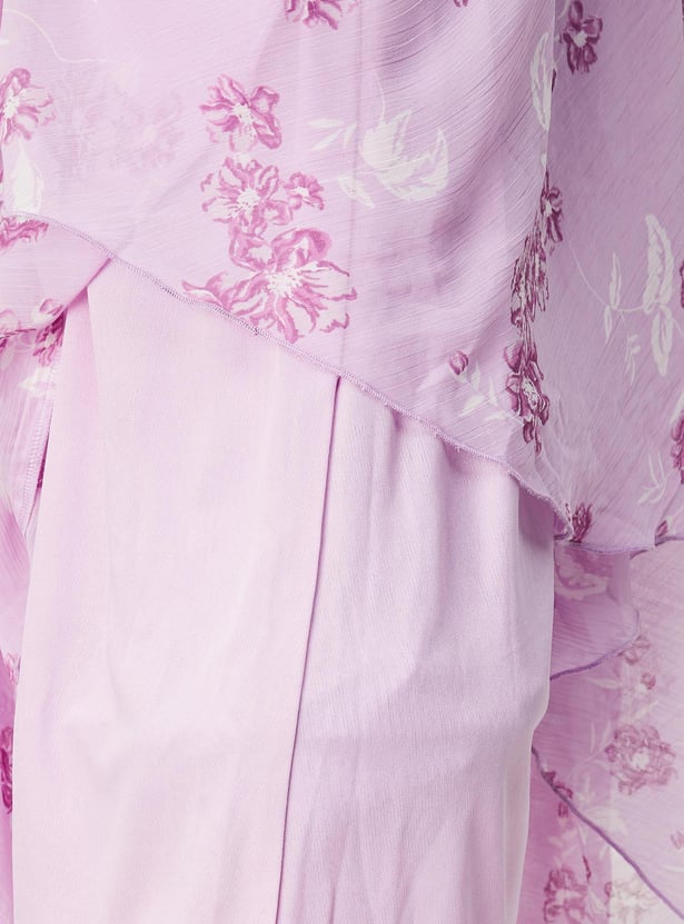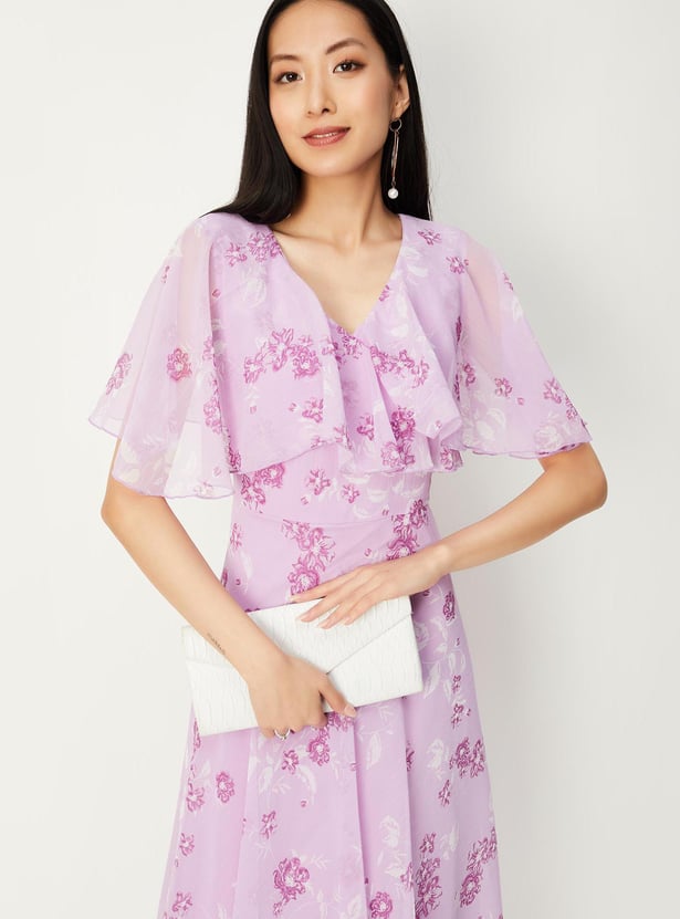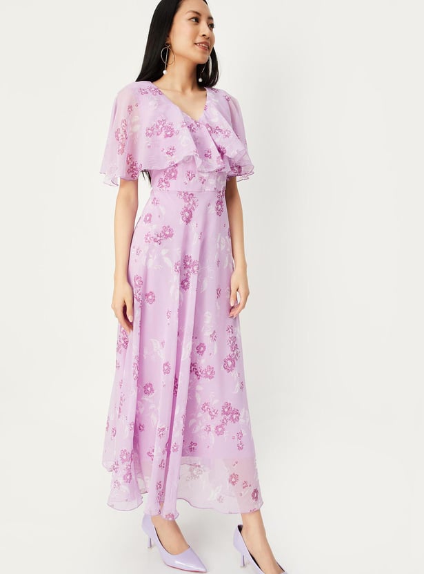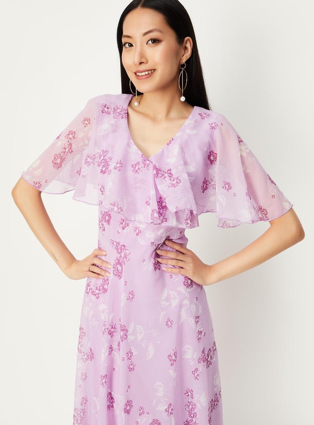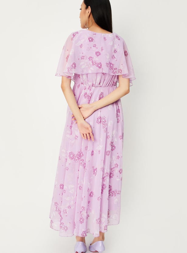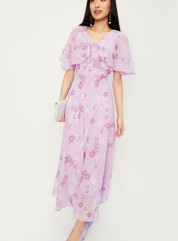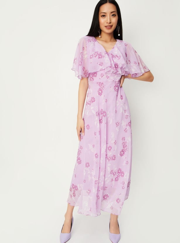 Wear this maxi dress for a weekend brunch featuring a floral print, a cape design, half sleeves and a V-neckline. Style this dress with sandals and a sling bag for an elevated look.