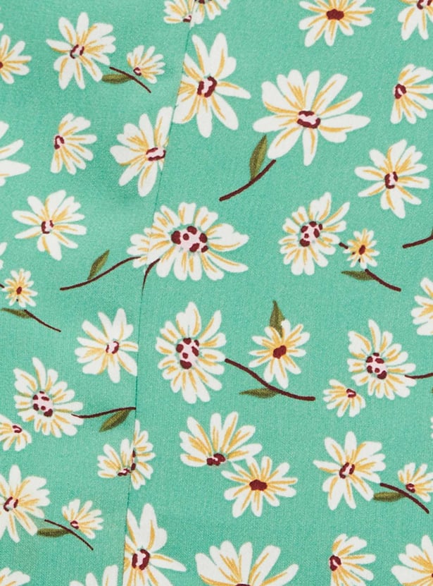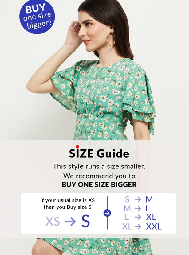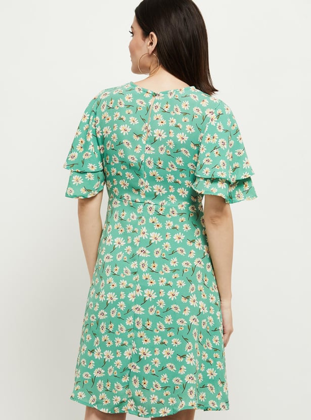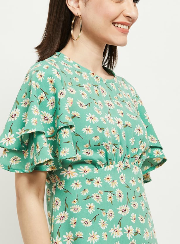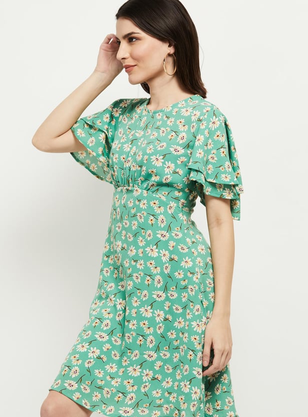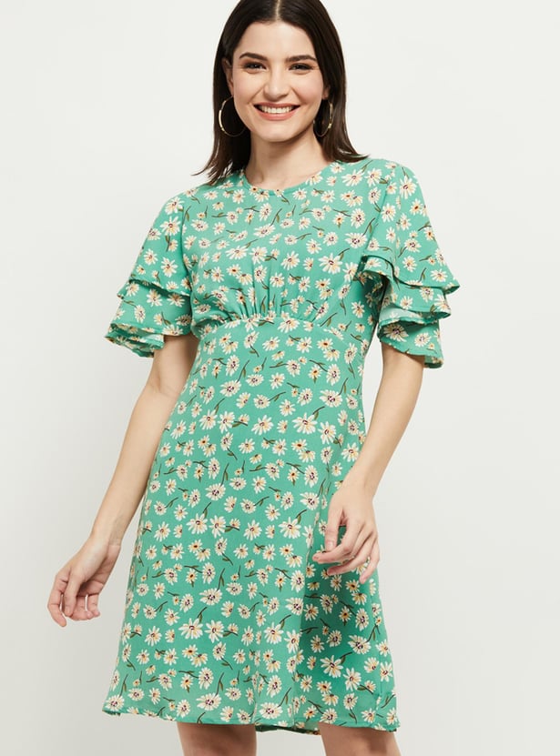 Flaunt a look of elegance in this knee-length dress that is updated with all-over floral print. It is constructed with a round neckline and short sleeves with ruffle detail.