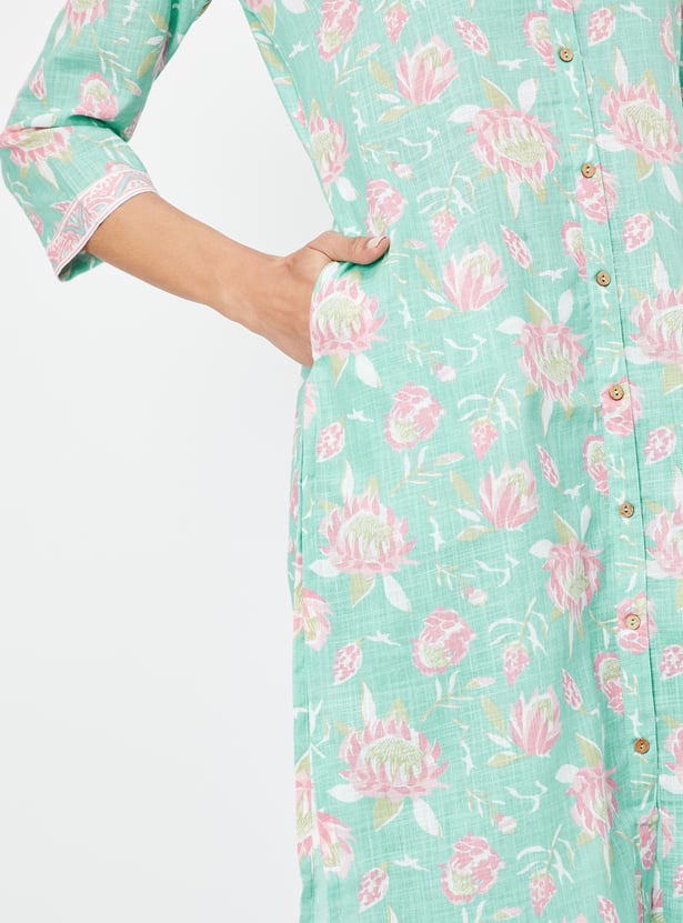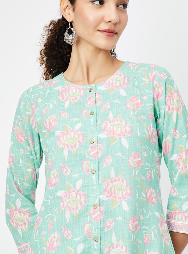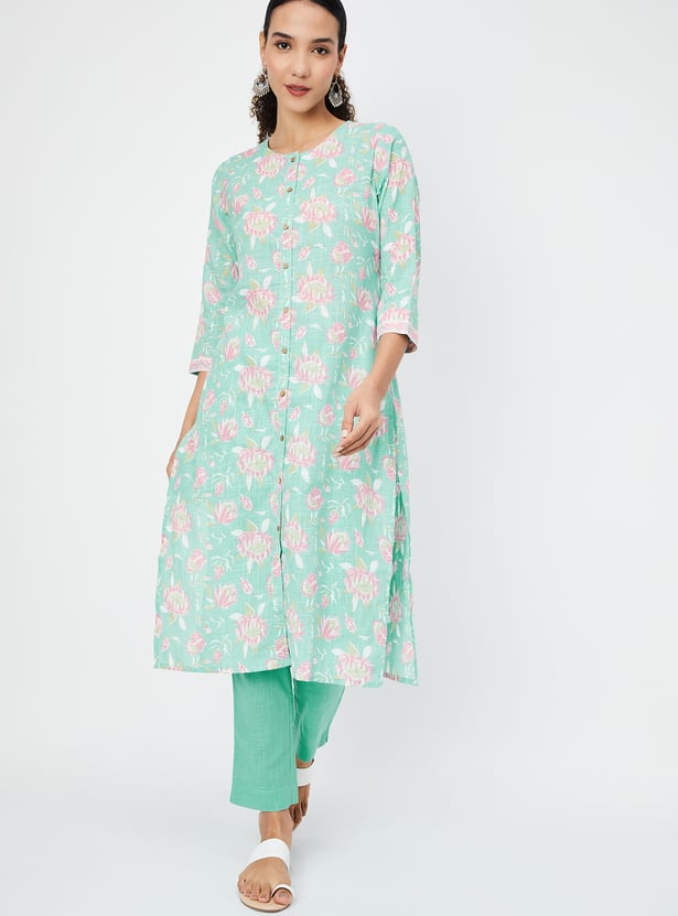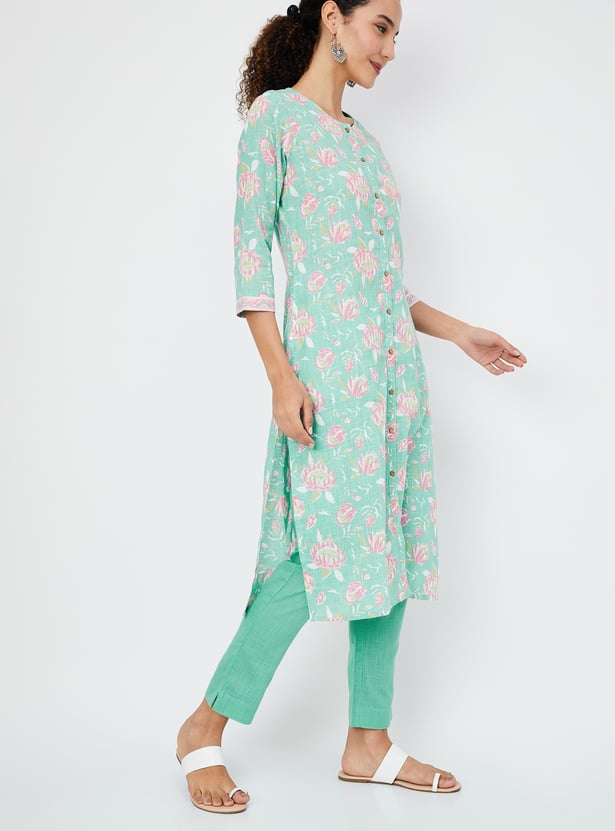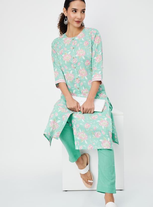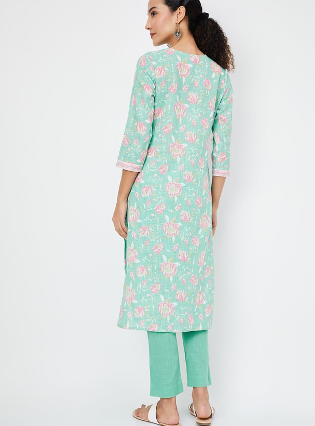 Embrace effortless elegance with this floral printed straight kurta set. The kurta features a round neck and three-quarter sleeves, exuding a timeless charm, while the straight pants with an elasticated waist ensure comfort and a perfect fit.