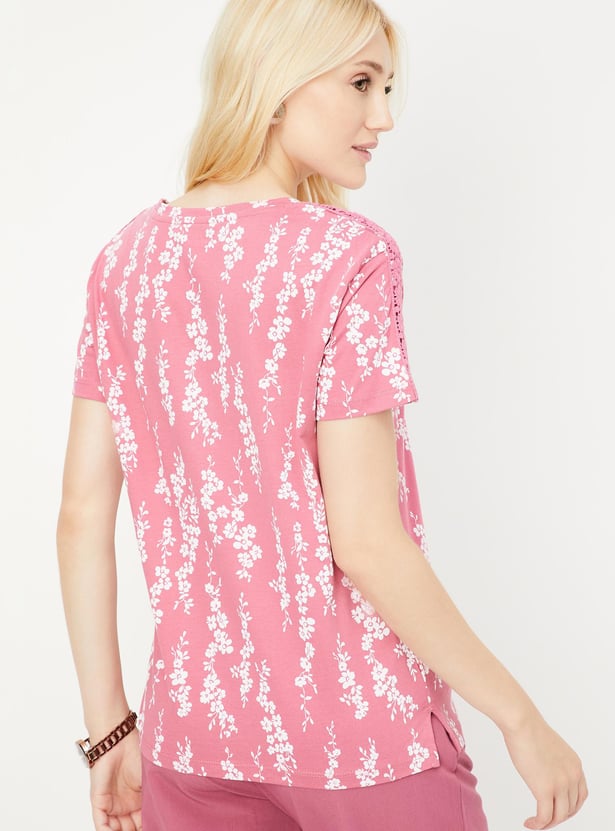 Elevate your casual wardrobe with this T-shirt with floral prints. It is styled with a round neckline and half sleeves with lace detail.