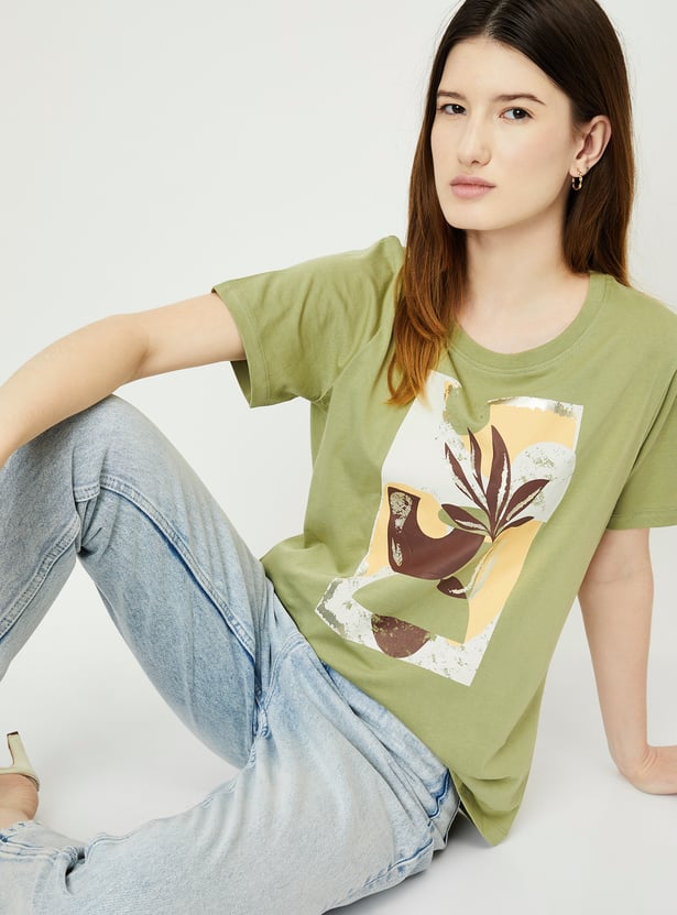 Boost your casual wardrobe with this stylish graphic-printed T-shirt. Featuring a round neck and short sleeves, it perfectly showcases your unique vibe.