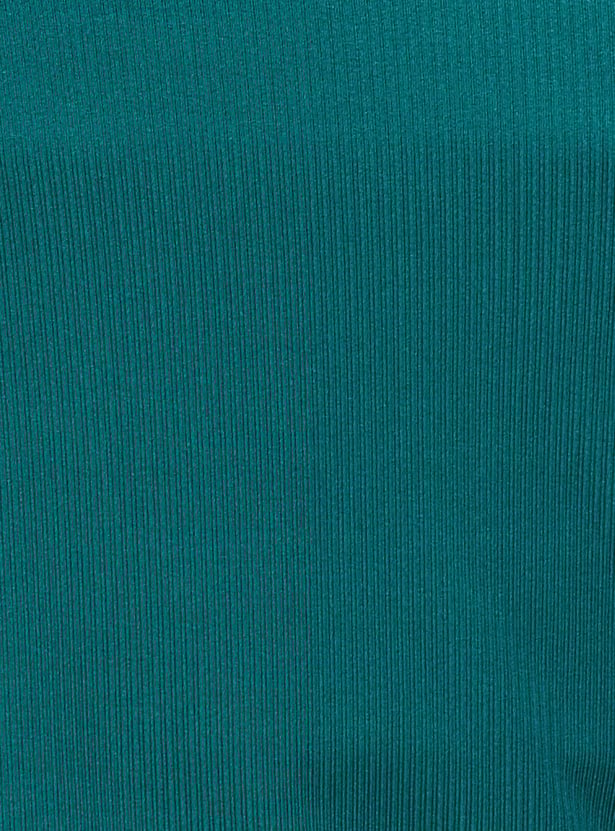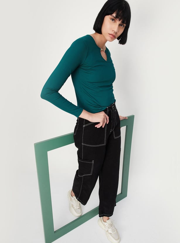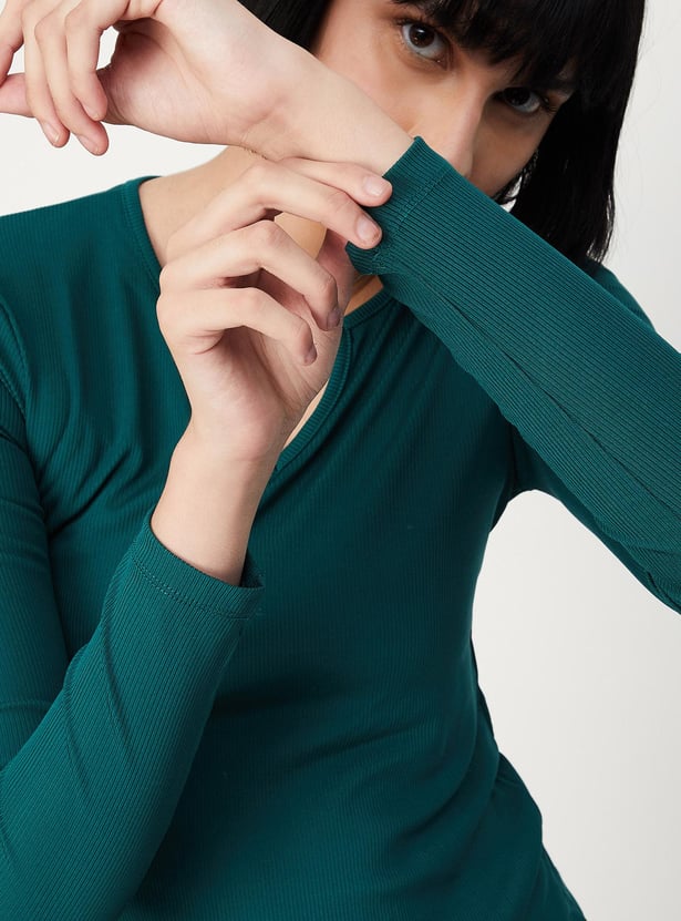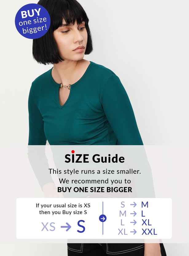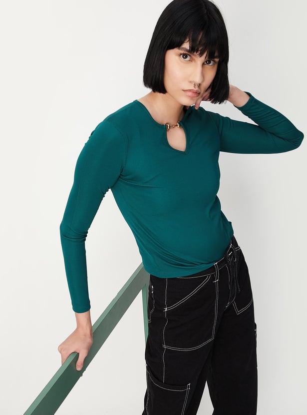 Let your style speak for yourself with this top. It comes with a ribbed surface, full sleeves, and a keyhole neckline. Team up this tee with a skirt and block heels to complete the look.