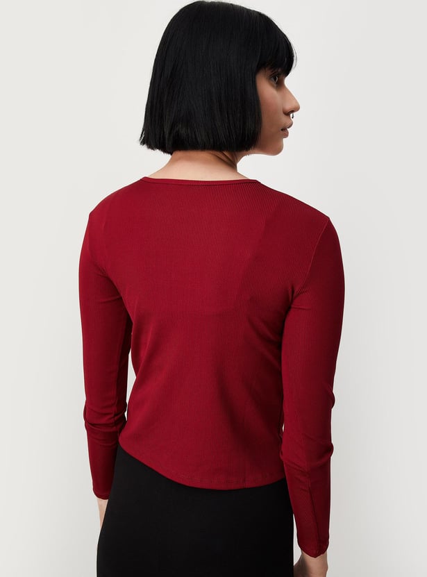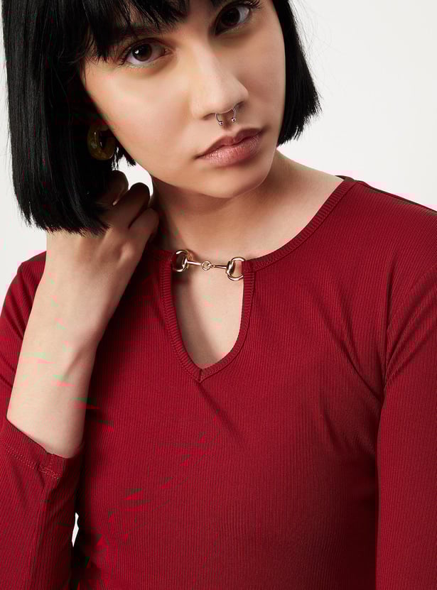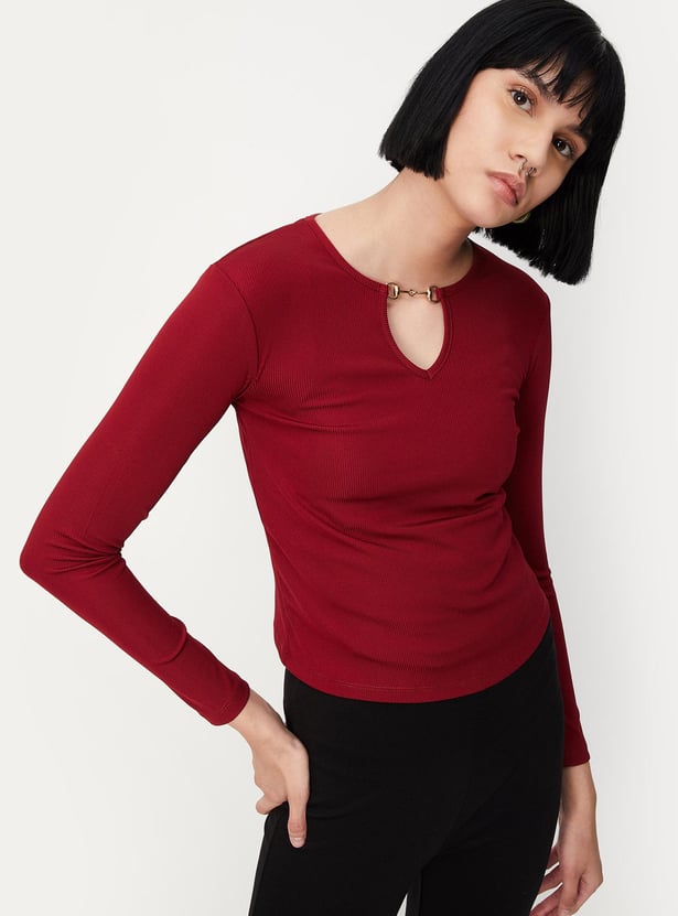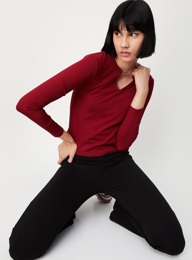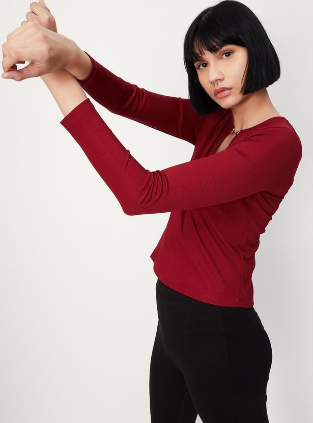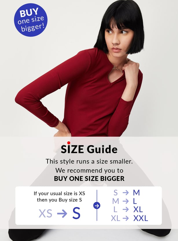 Let your style speak for yourself with this top. It comes with a ribbed surface, full sleeves, and a keyhole neckline. Team up this tee with a skirt and block heels to complete the look.