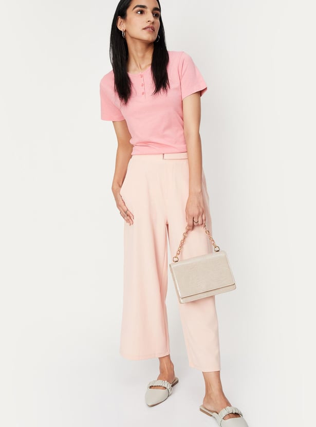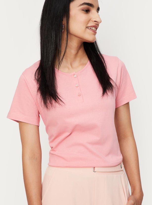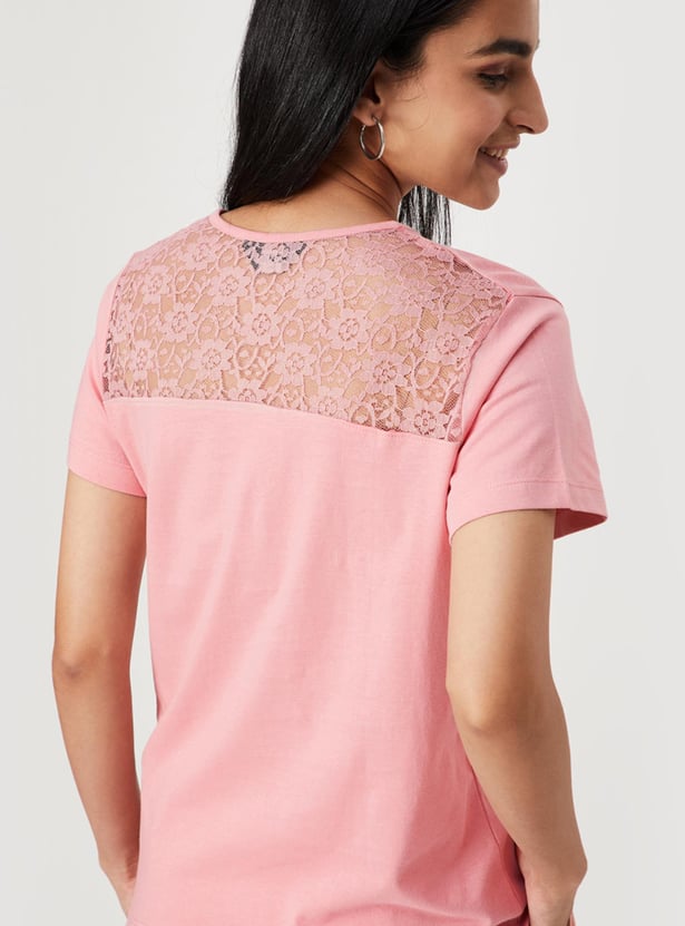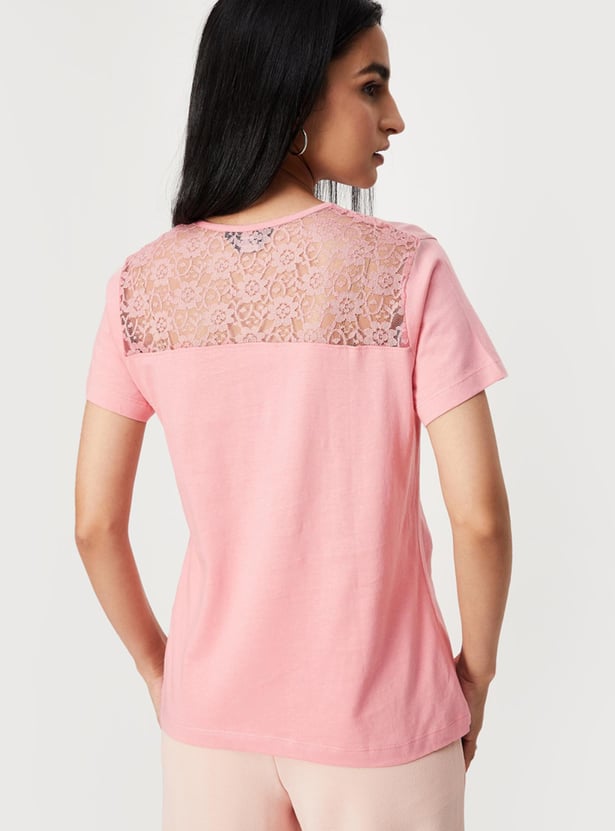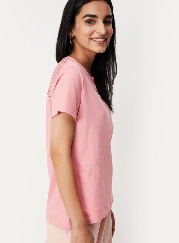 Spruce up your everyday wardrobe with this top that is updated with a lace yoke at the back. It is designed with a Henley neck and short sleeves. For a casual day look, style this top with a skirt and block heels.
