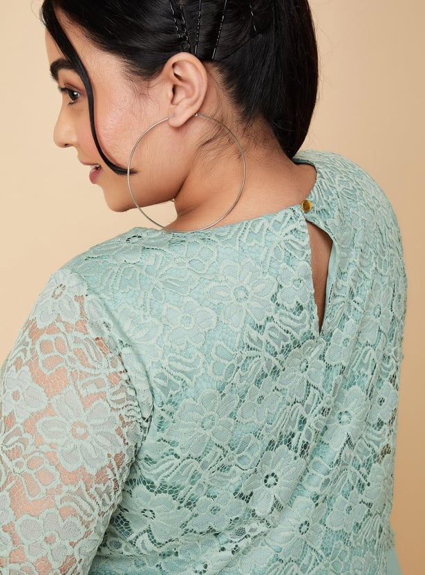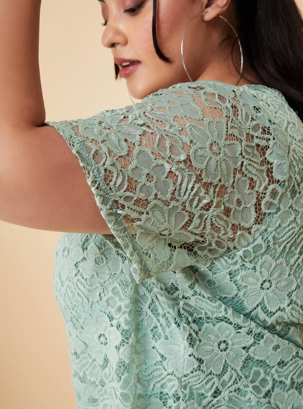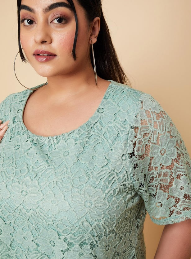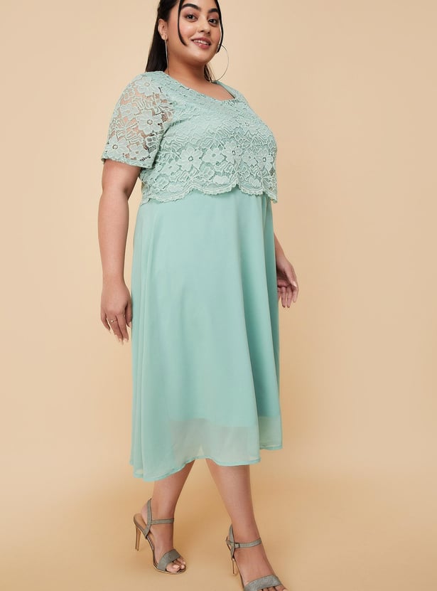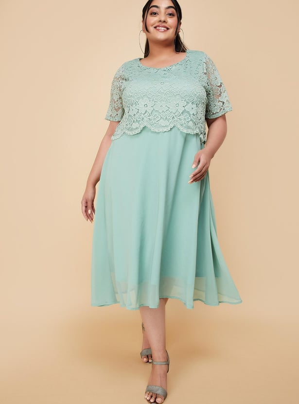 An epitome of elegance, this midi-length dress is a perfect pick for an evening out with friends. It is designed with a round neck, half sleeves, a lace overlay that gives an illusion of a layered look, and a flared hem. Model Size :