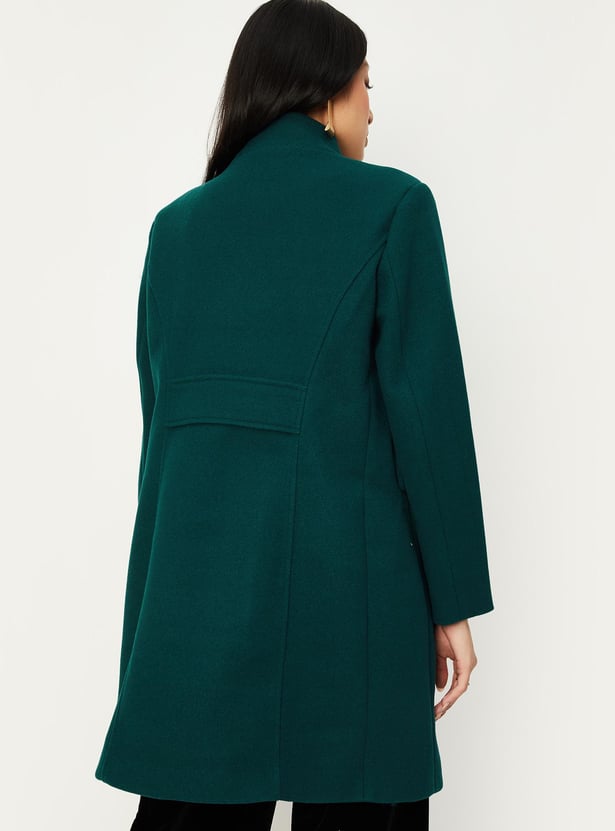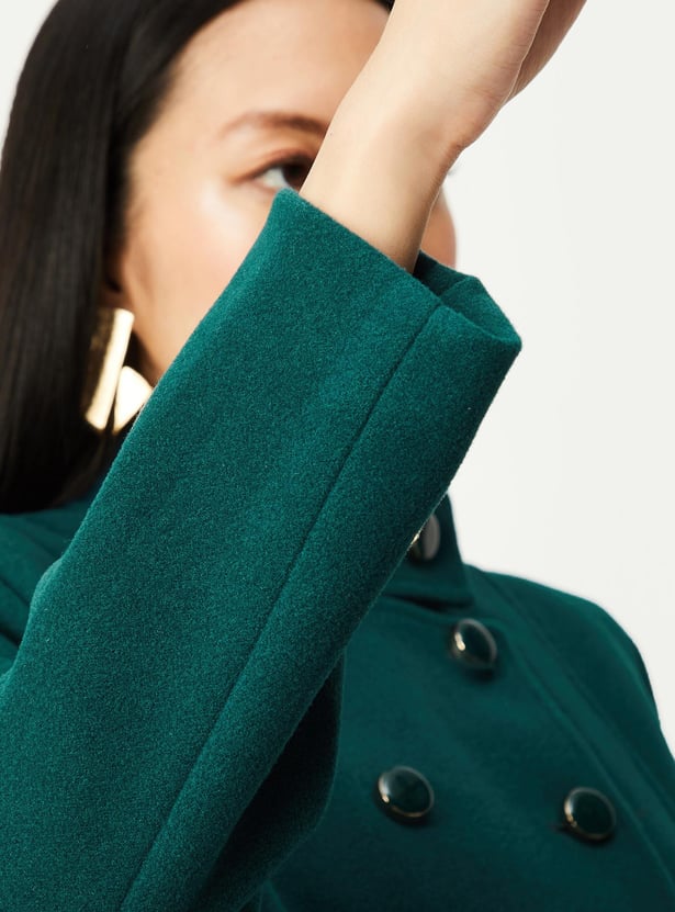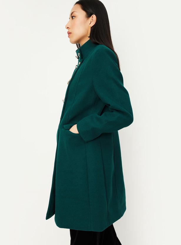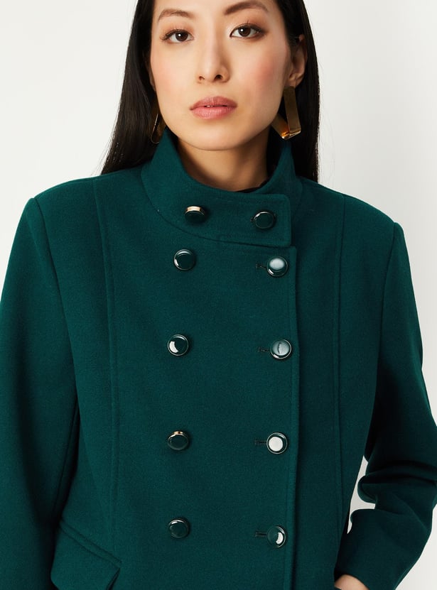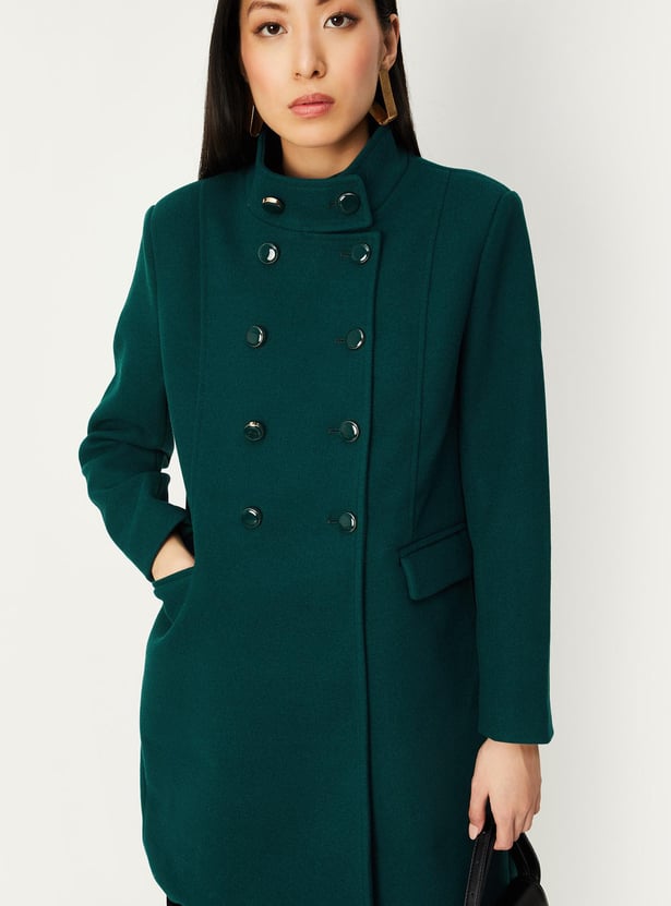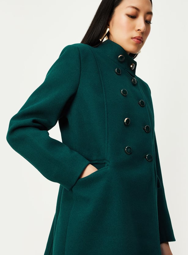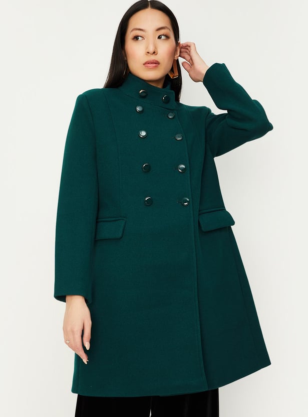 A quintessential winter essential, this military-inspired coat exudes power and sophistication. It has a band collar, double-breasted design, overlapping front, and full sleeves. This long jacket is equipped with flap pockets