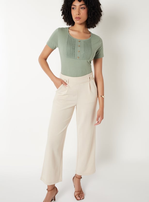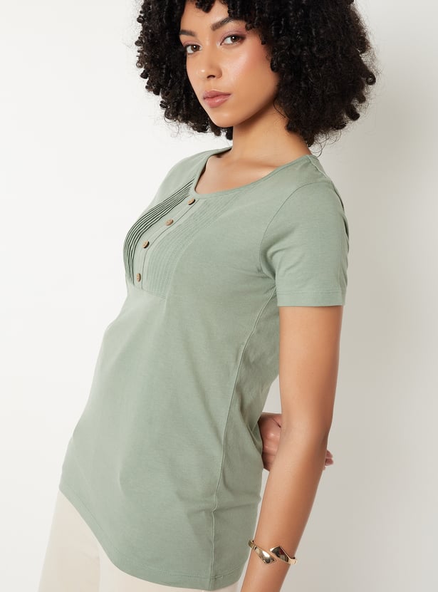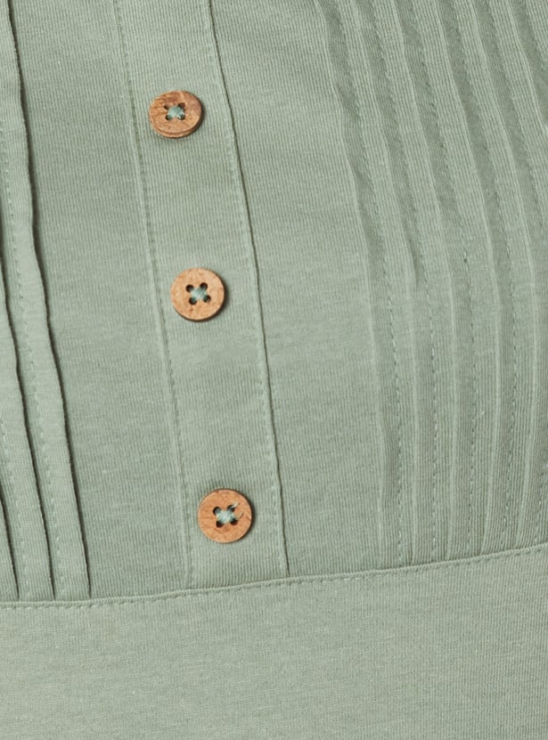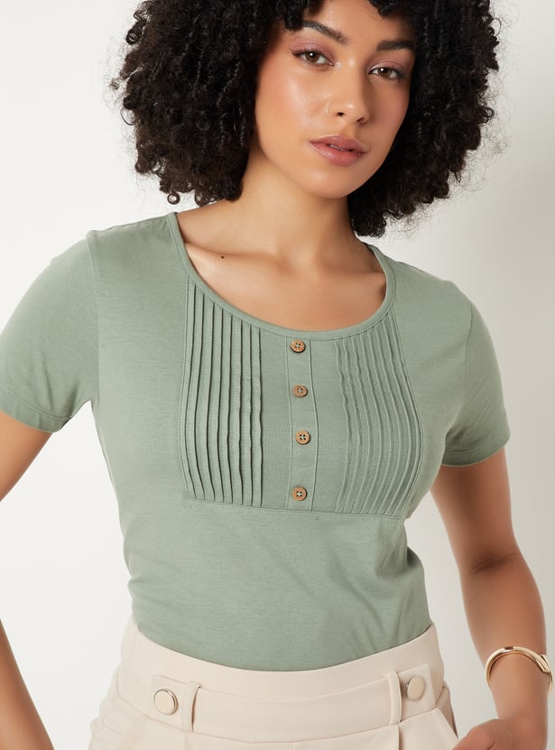 Elevate your everyday wardrobe with this pintuck yoke Top, designed to blend subtle texture with timeless ease. The round neckline and half sleeves offer a classic silhouette, while delicate pintuck detailing at the yoke adds a refined touch of craftsmanship. Model Size :