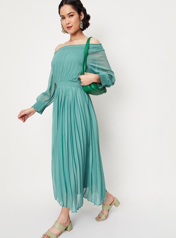 Nothing says summer chic like this maxi dress. It features an off-shoulder neck, bishop sleeves, a pleated skirt, and a smocked trim. A pair of block heels with this dress takes your style to new heights.