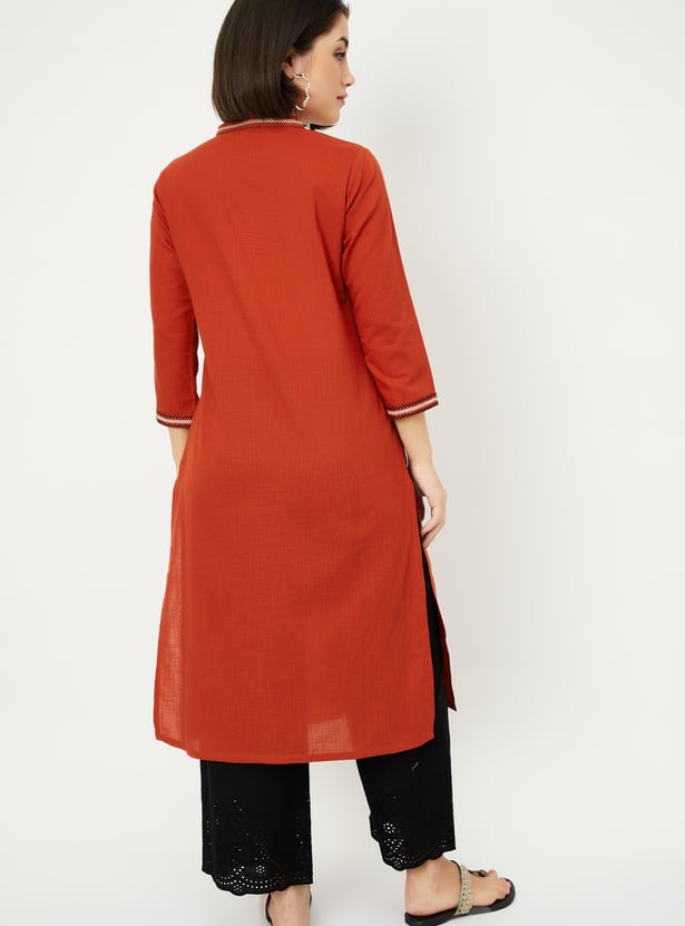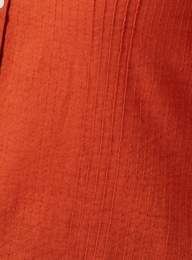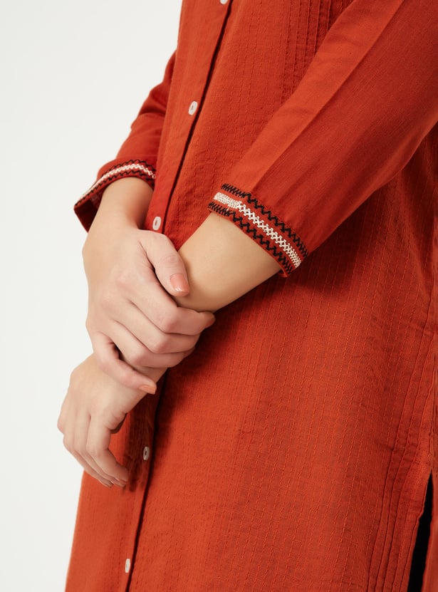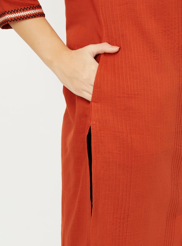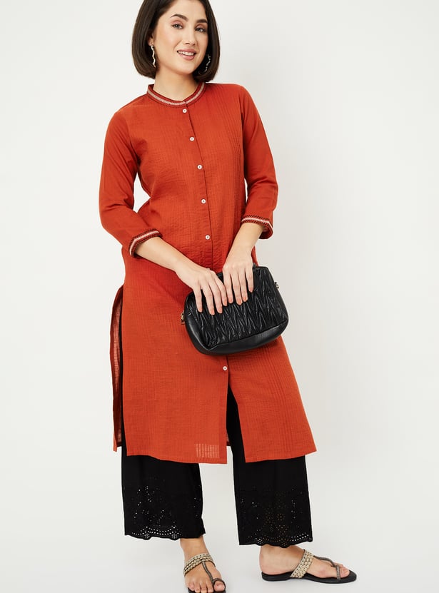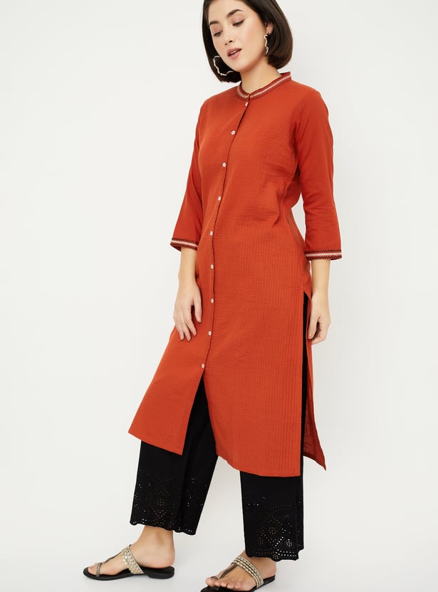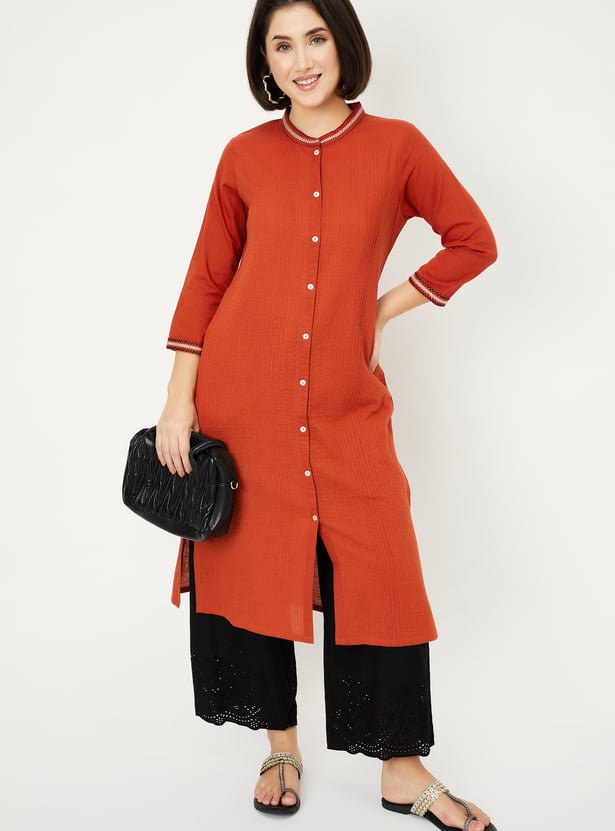 This pleated straight kurta features a band collar, button front, and 3/4th sleeves, offering a refined, elegant look. The side slits add a contemporary touch while providing comfort and ease of movement.