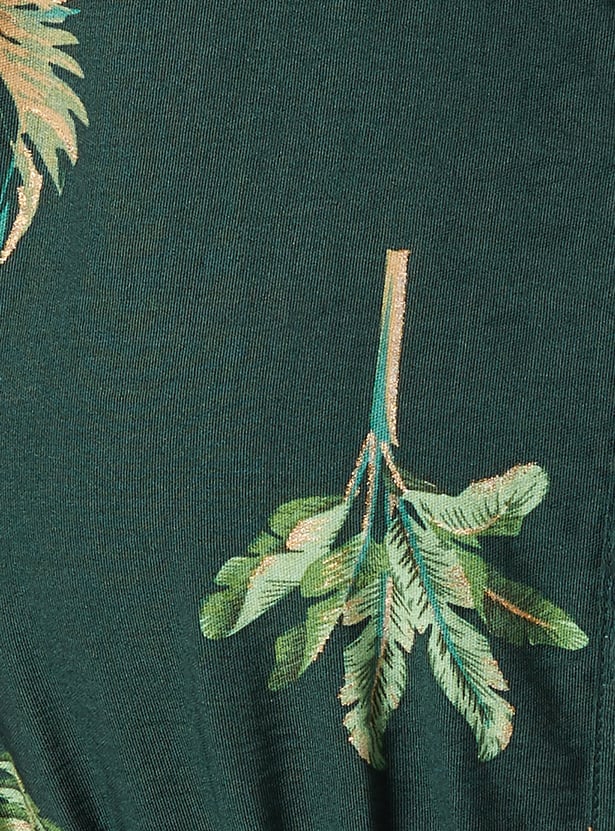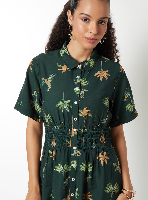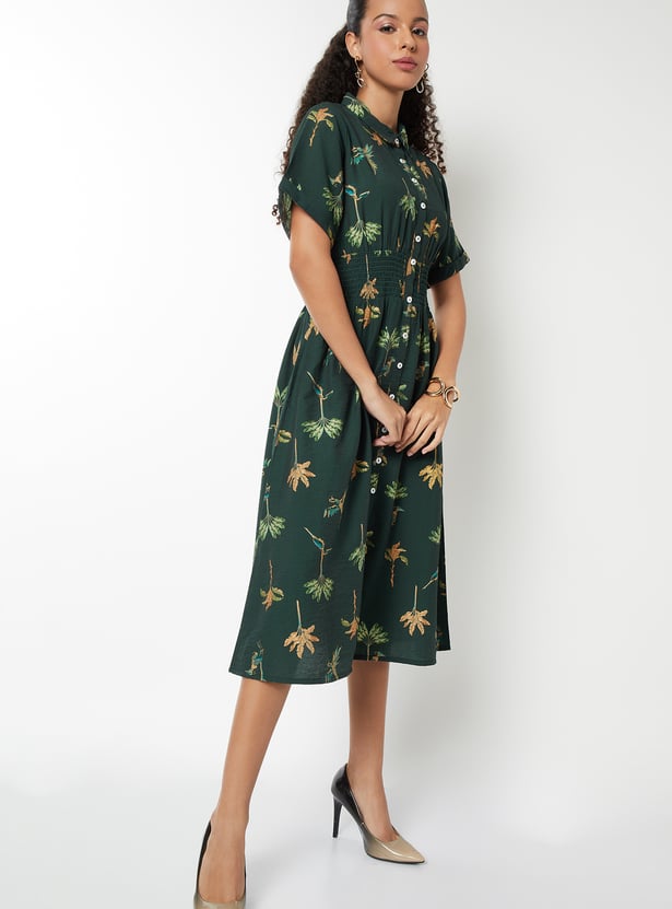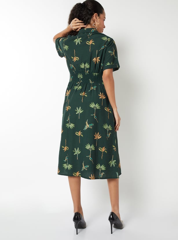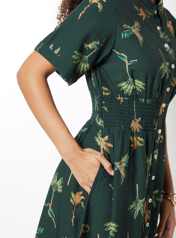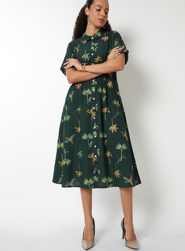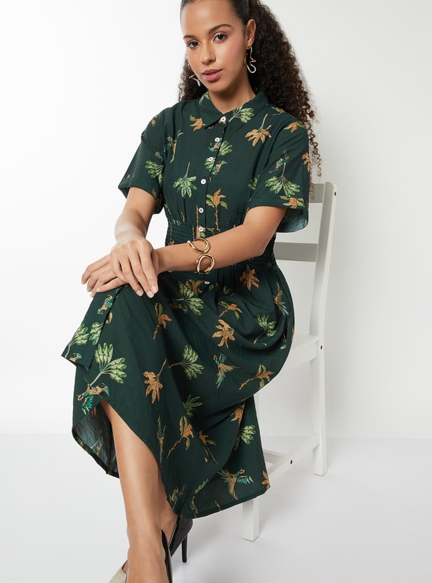 Step into effortless style with this printed A-line midi dress, smocked waist, featuring a charming button placket and a smart spread collar. The flowy silhouette and delicate floral pattern make it perfect for both casual days and semi-formal outings.