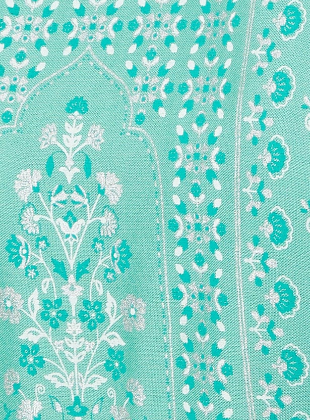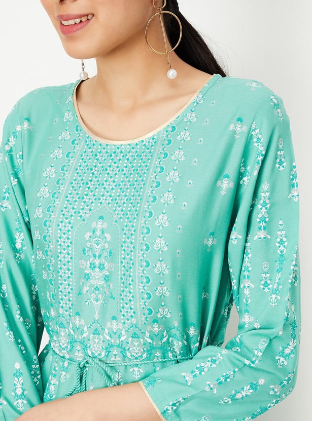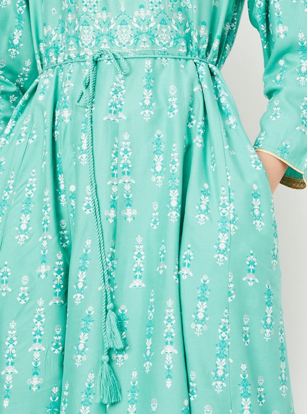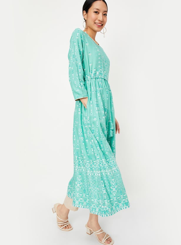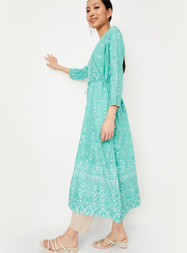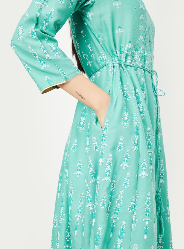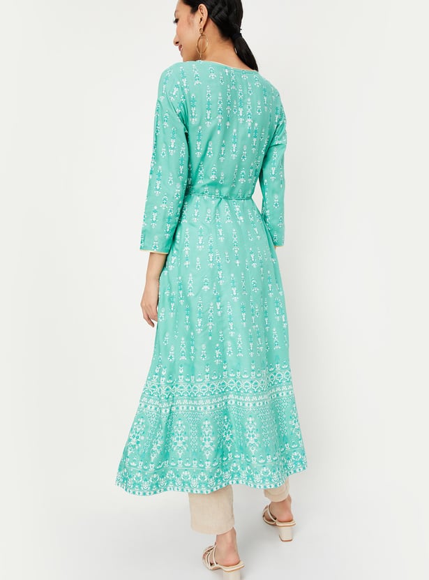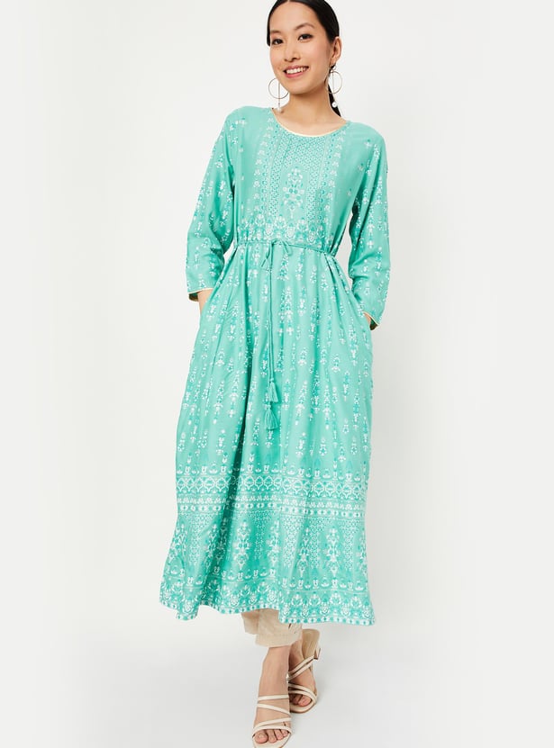 Paint a picture of elegance in this Anarkali kurta. It has a round neckline, three-quarter sleeves, contrast trim, side pockets, and a tie-up at the hem. This kurta has attractive ethnic prints, a flared hem, and a calf-length profile. This kurta is complemented with a pair of straight pants and block heels.