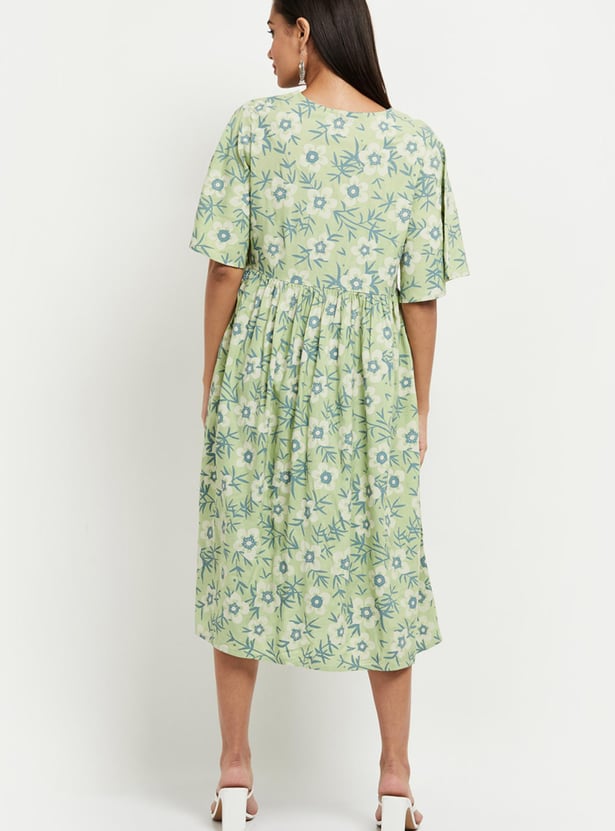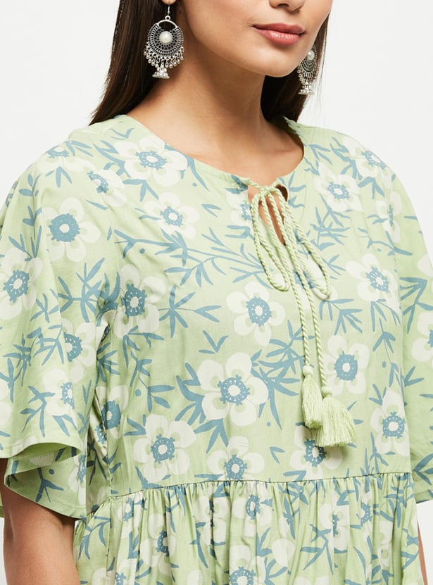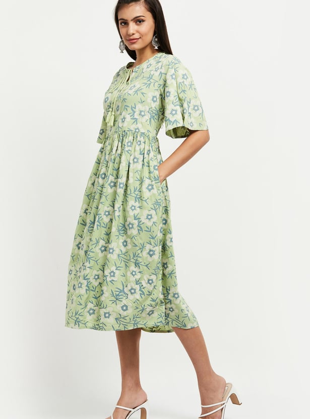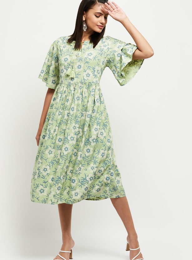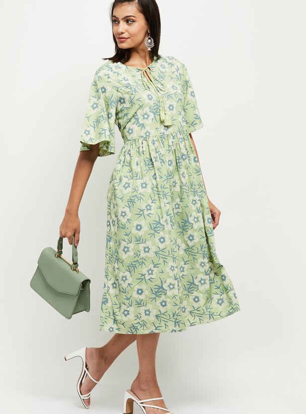 Elegant and comfortable, this printed A-line dress which has a tie-up neck, bell sleeves, and a midi silhouette is all you need to ensure your wardrobe is up to date.