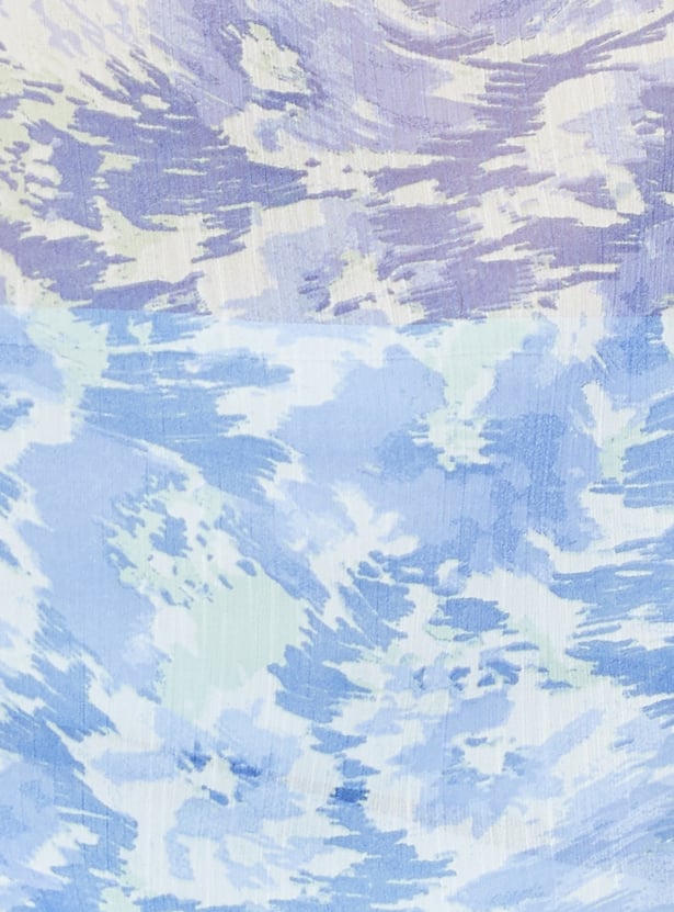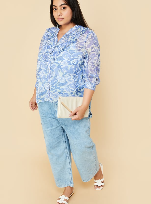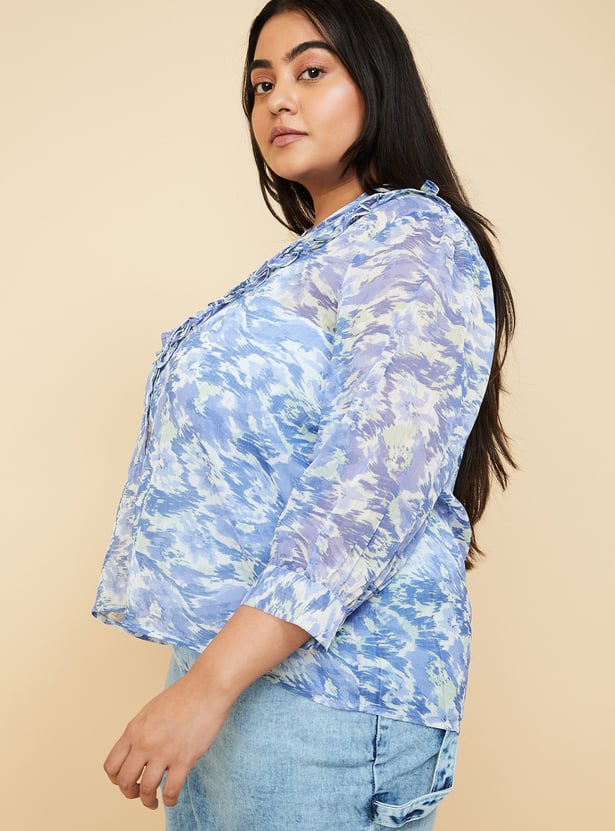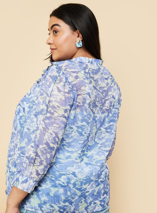 Brighten your day with this blouse, updated with vibrant prints all over. It has a band collar, three-quarter sleeves, elasticated cuffs, ruffled detailing, and a curved hem. This top comes with a solid camisole.