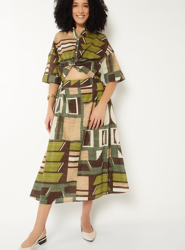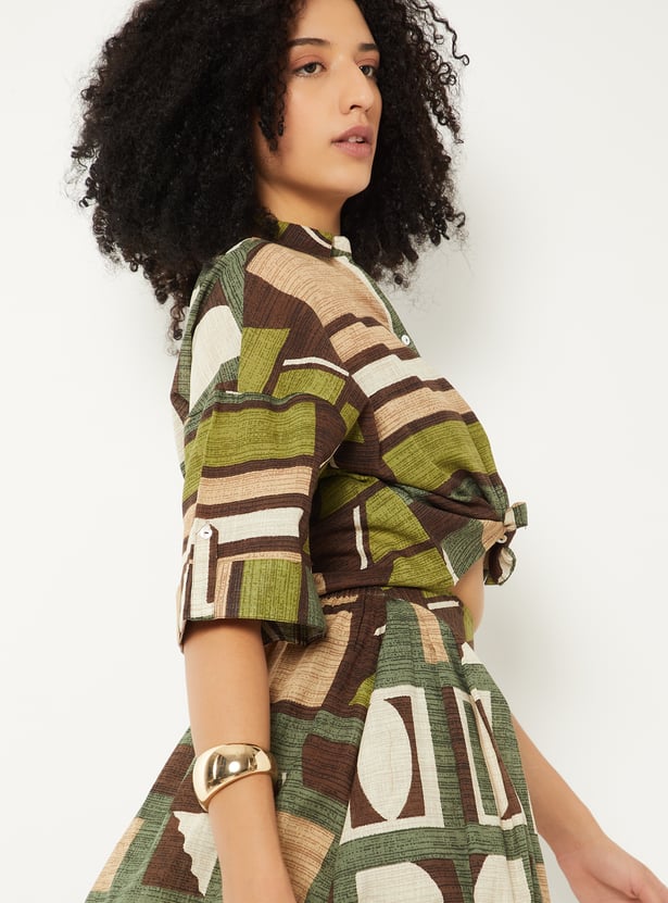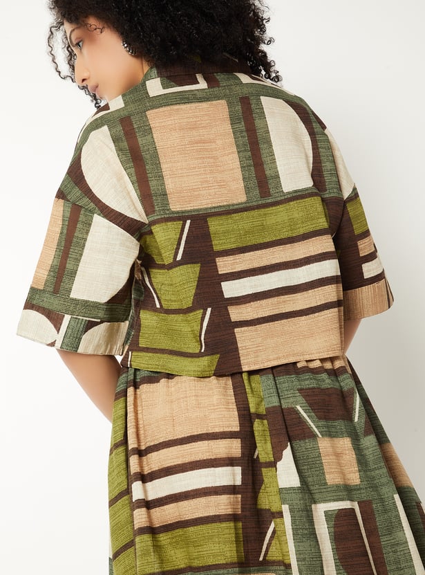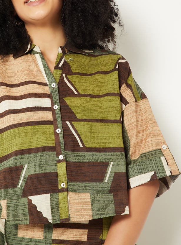 Refresh your casual wardrobe with a modern edge in this printed crop shirt, designed for effortless style. Featuring a sharp spread collar, classic button placket, and breezy half sleeves, it blends structure with a playful cropped silhouette for versatile wear.