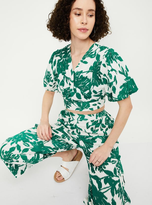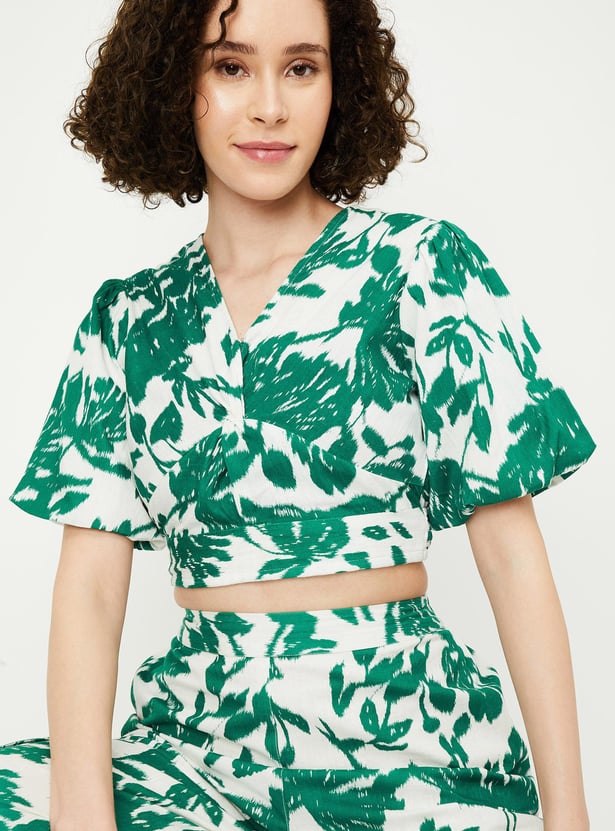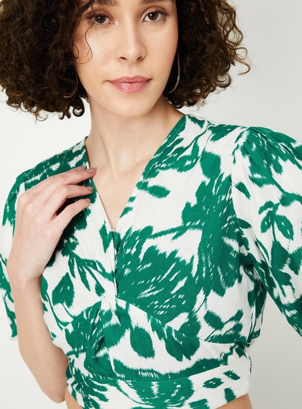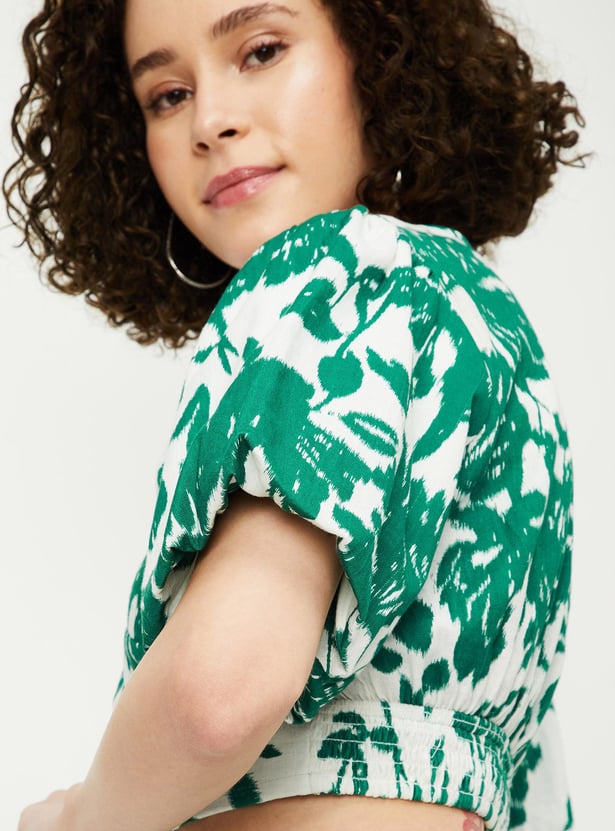 Give your wardrobe an impressive update with this crop top. The botanical-inspired prints amp up the style. It has a knotted detail at the front, puffed sleeves that add a hint of drama, and a V-neckline. The smocked hem adds a flattering finish.