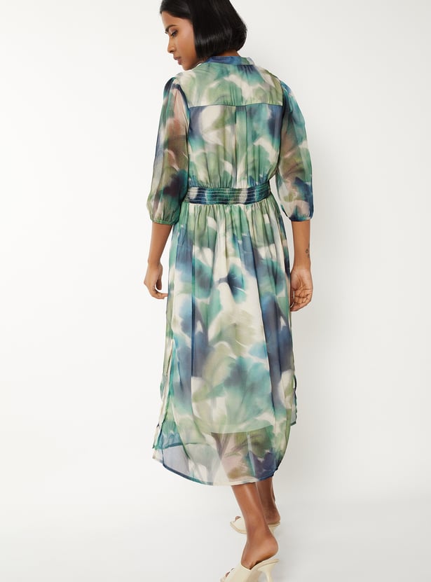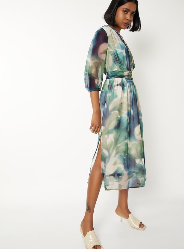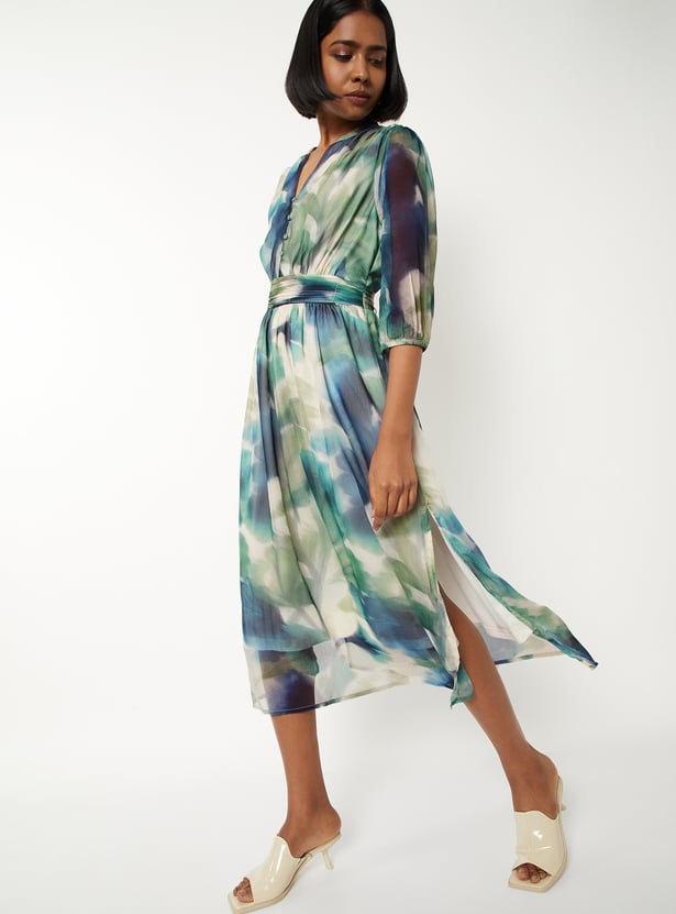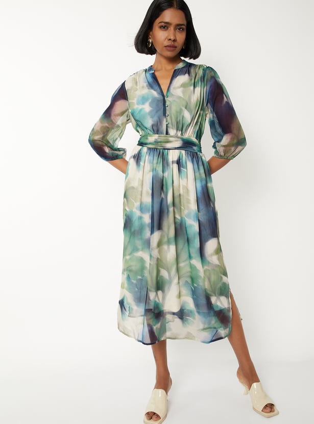 Turn heads in this printed fit & flare dress, designed with a chic band collar and elegant three-quarter sleeves. The flattering silhouette is enhanced by a subtle side slit, adding movement and modern flair. Perfect for brunches, office wear, or evening strolls—this dress blends comfort with effortless style. Model Size :
