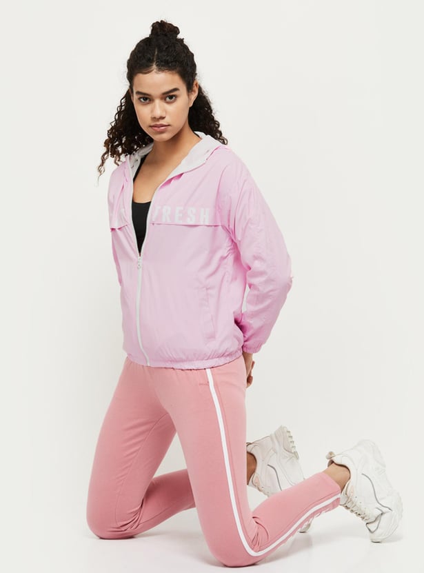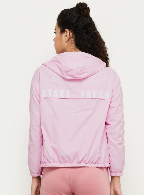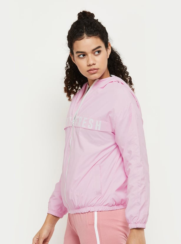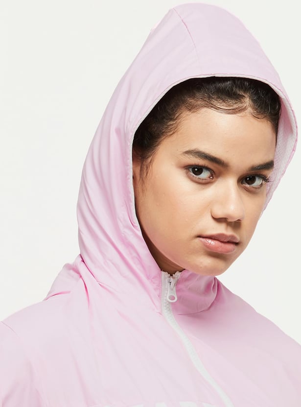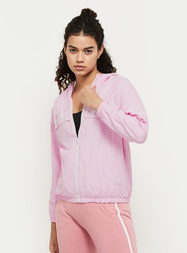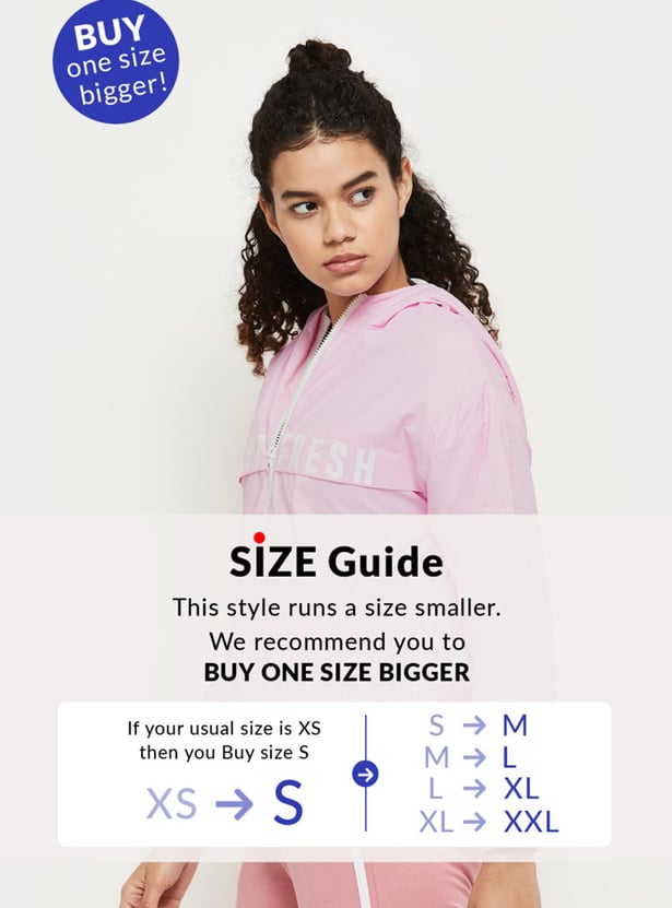 Highlighted with typographic prints on the chest flap, this windcheater jacket features a hooded neck, zip front, long sleeves, and a shirred hem. Layer up this jacket over your sports bra and joggers for a gym-ready look.