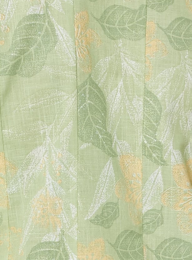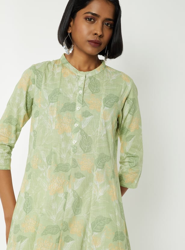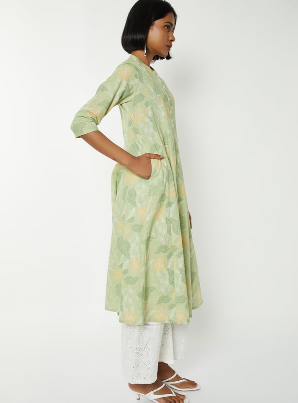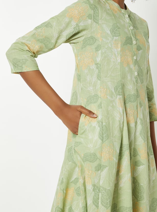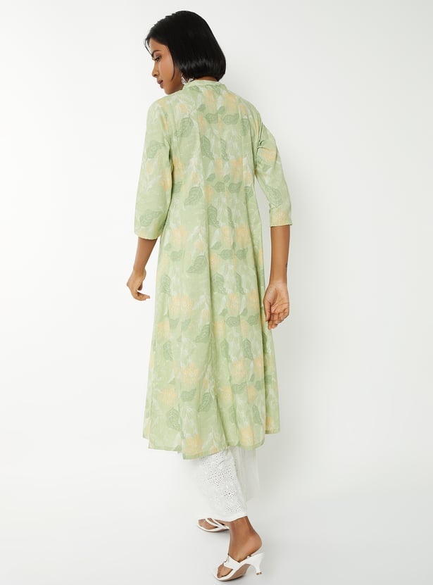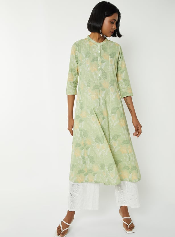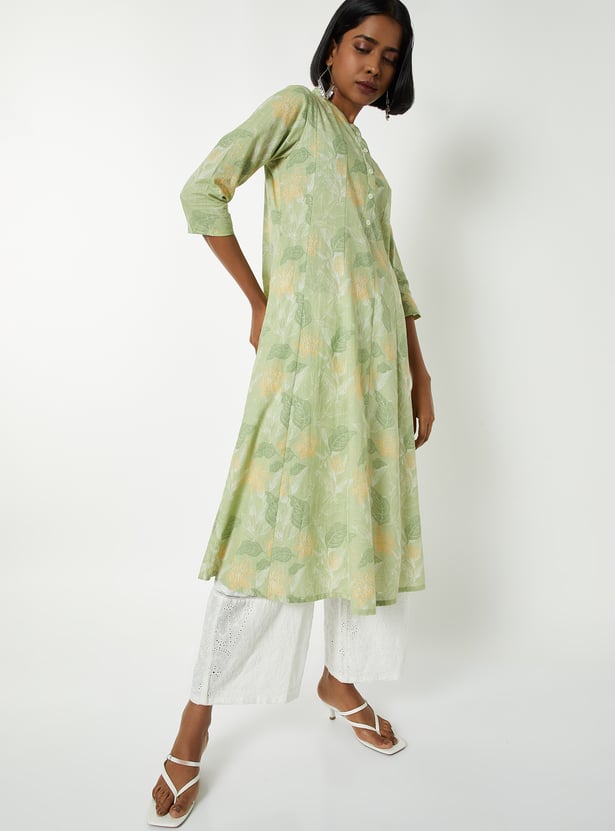Step out in elegant charm with this printed kalidar kurta. Featuring a band collar, button closure, and 3/4th sleeves, it combines style with a comfortable fit.
