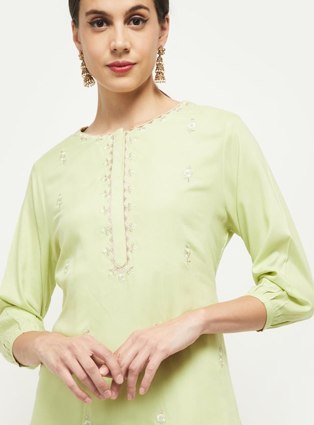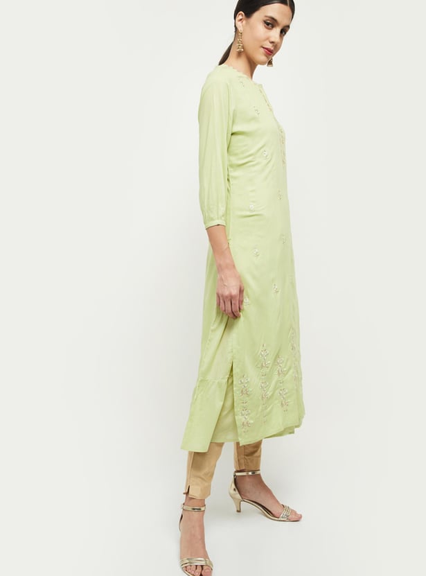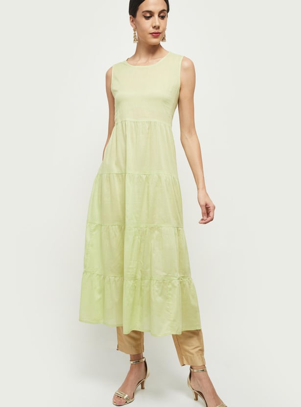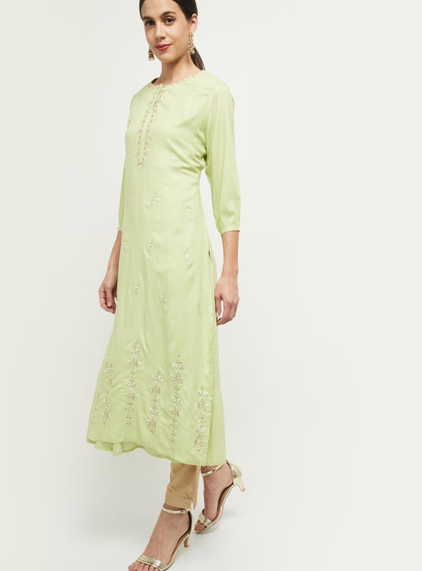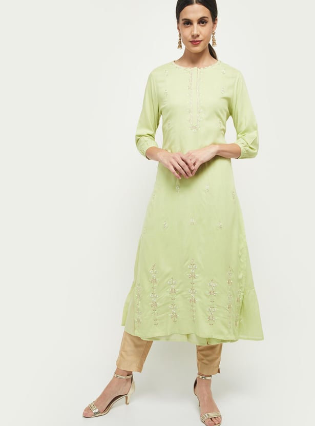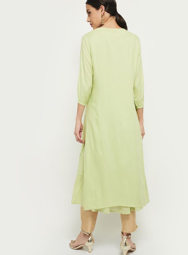 Bring a fusion to your ethnic ensemble with this layered A-line kurta that's designed with bold prints, three-quarter sleeves, and a round neckline.