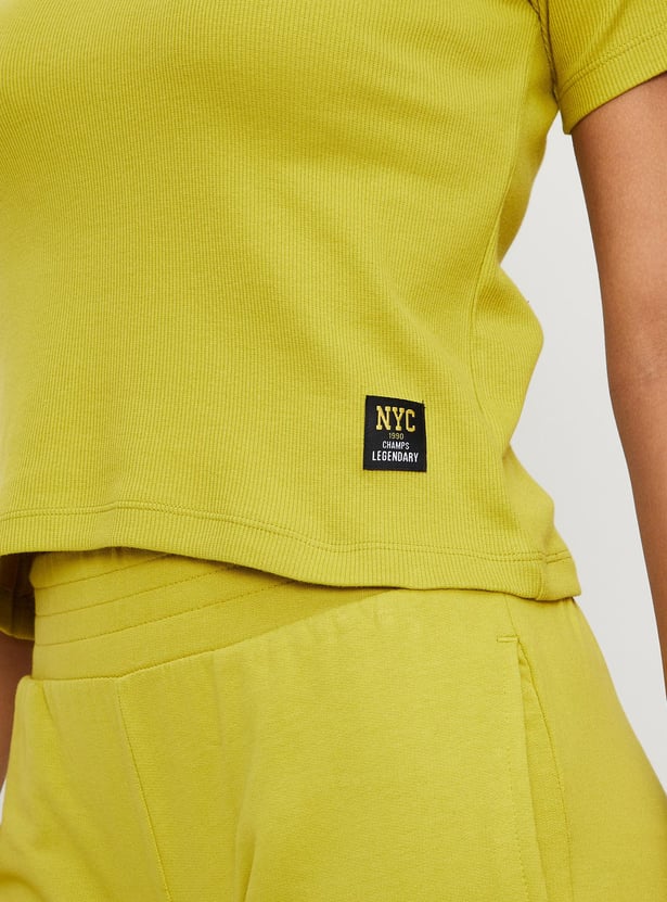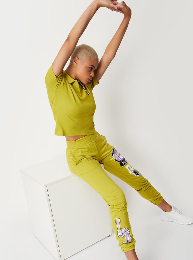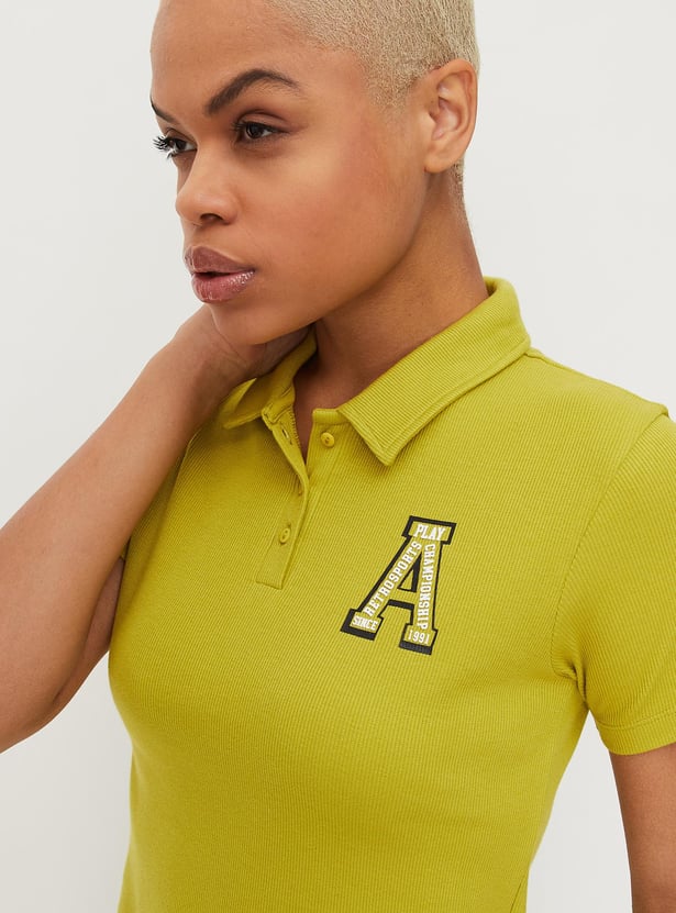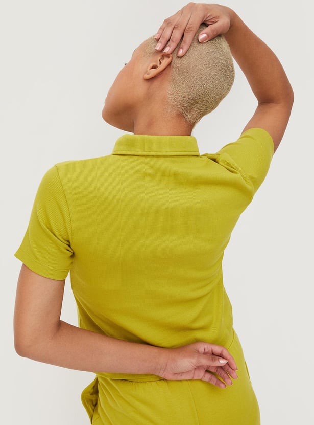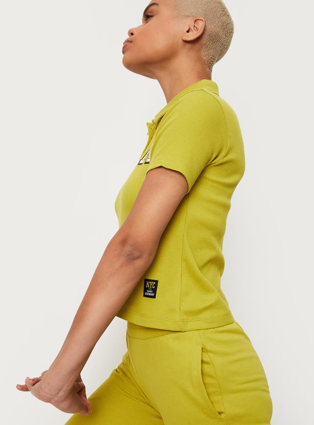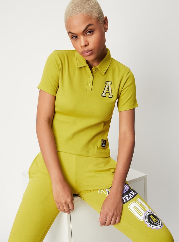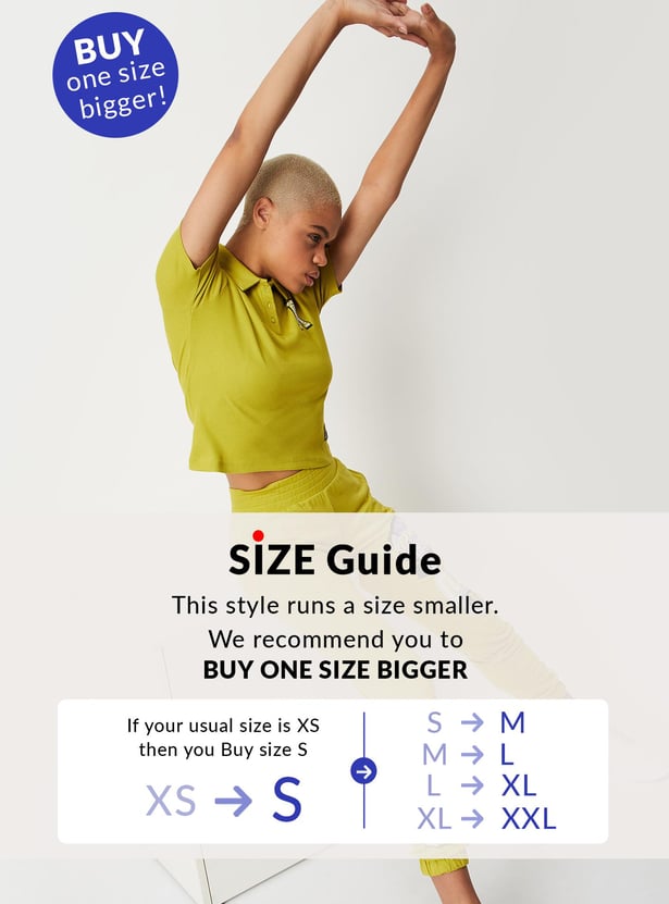 Bring a fashionable twist to your casual collection with this crop t-shirt. It is designed with a printed surface, polo collar, and half sleeves. To make this crop t-shirt stand out team it up with a pair of joggers and lace-up shoes.