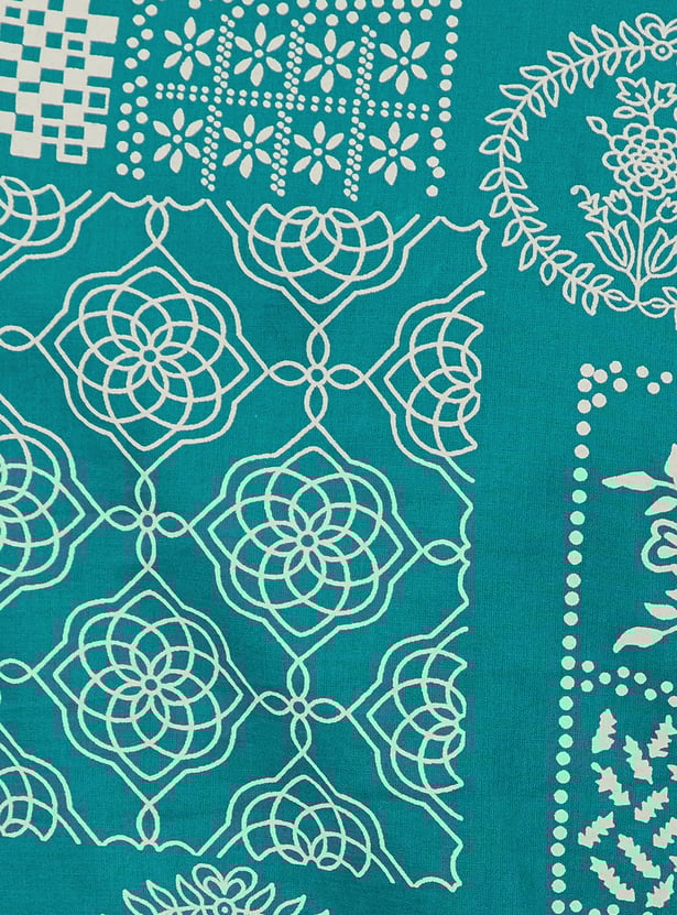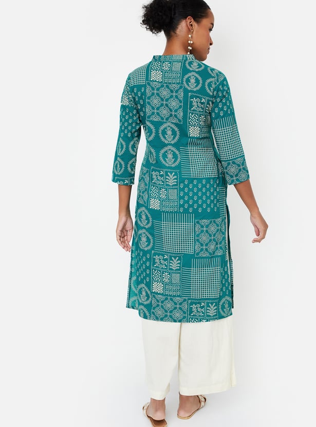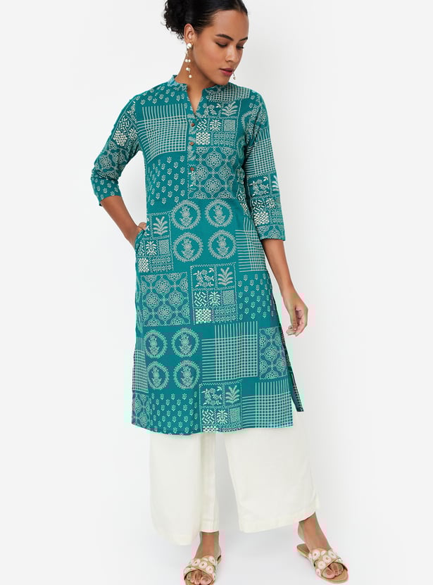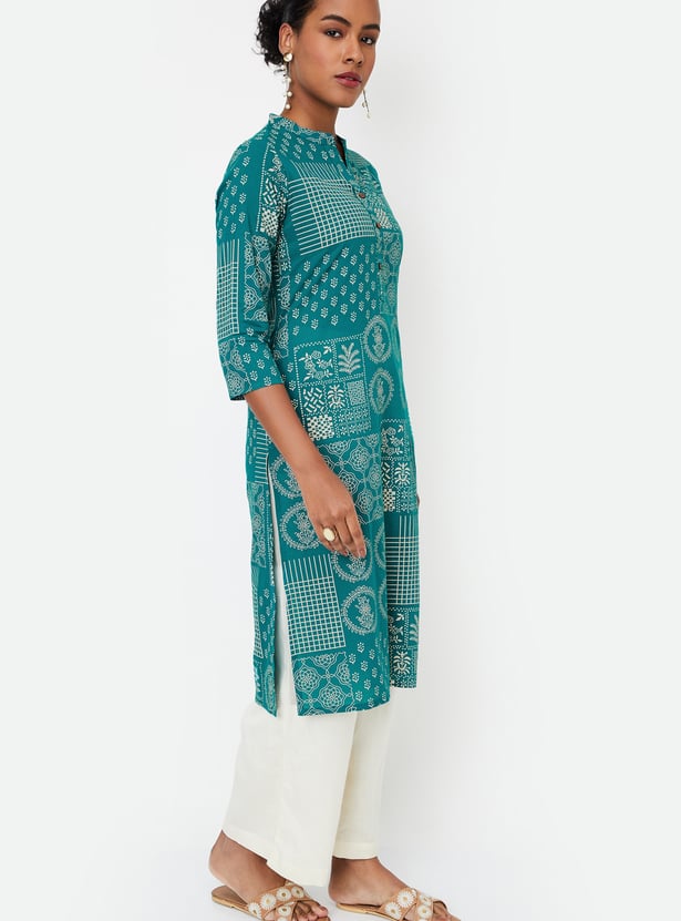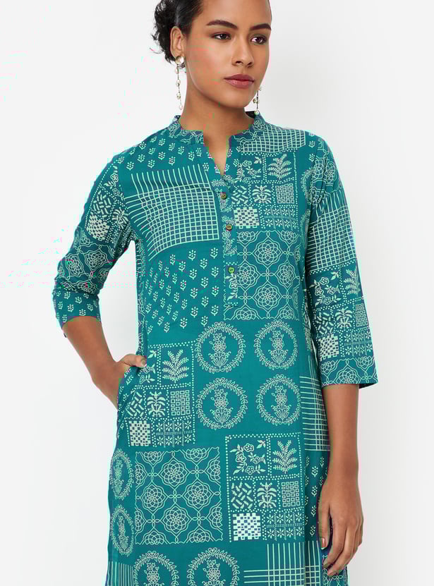 Elevate your casual wear with this stylish kurta, featuring an all-over print that adds a pop of flair to your everyday look. The band collar with a half-button placket brings a classic touch, while the three-quarter sleeves and practical pockets ensure both comfort and functionality.
