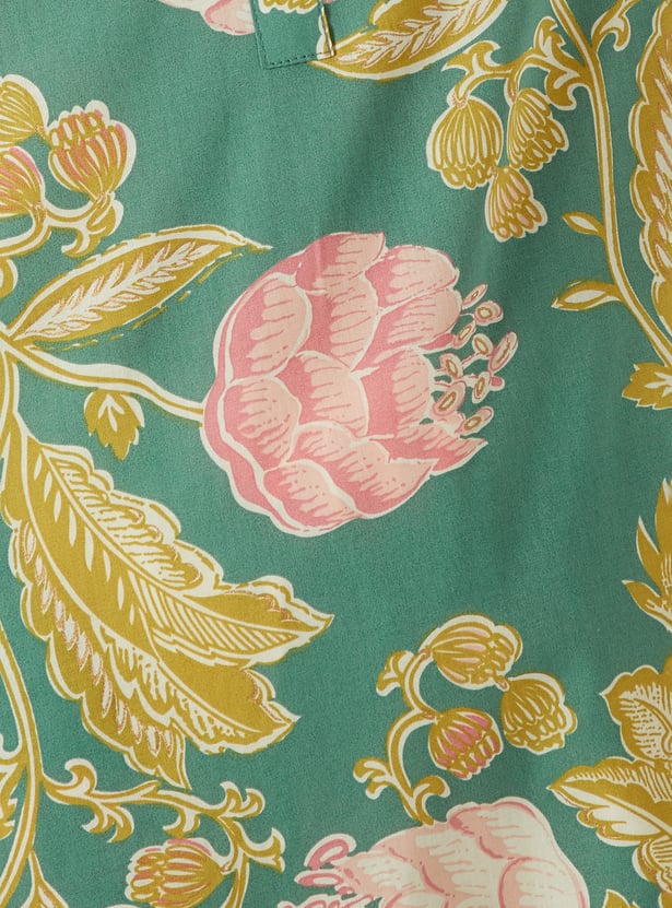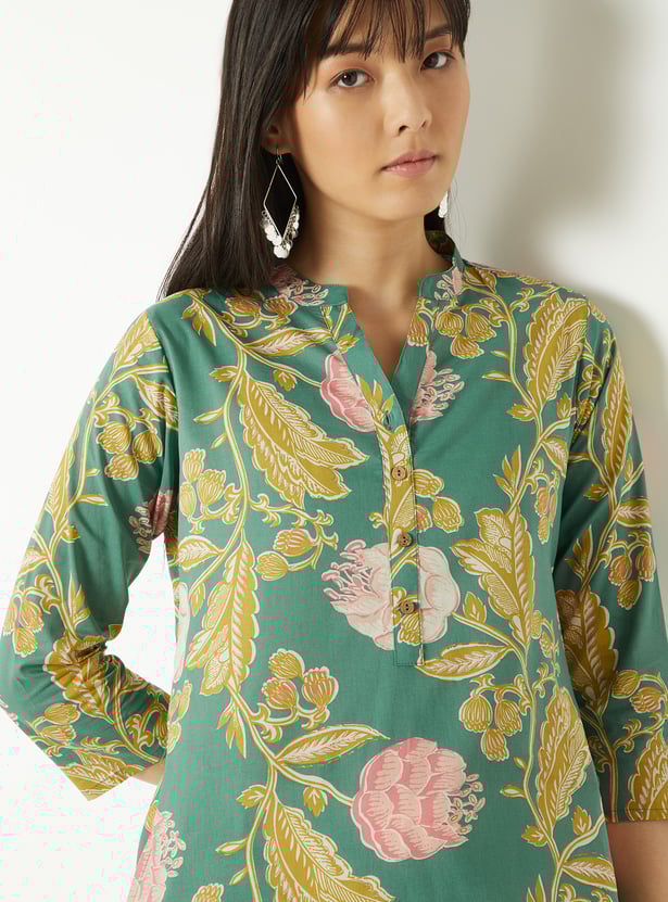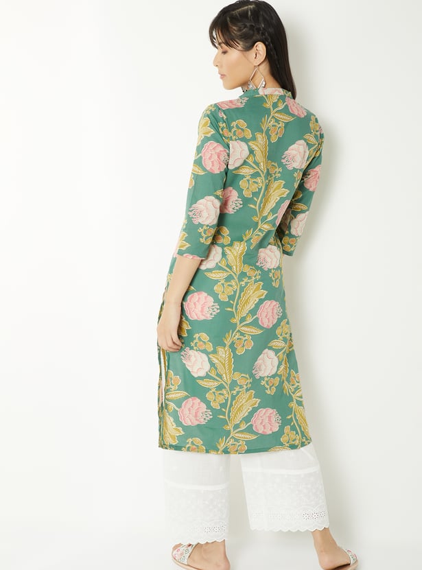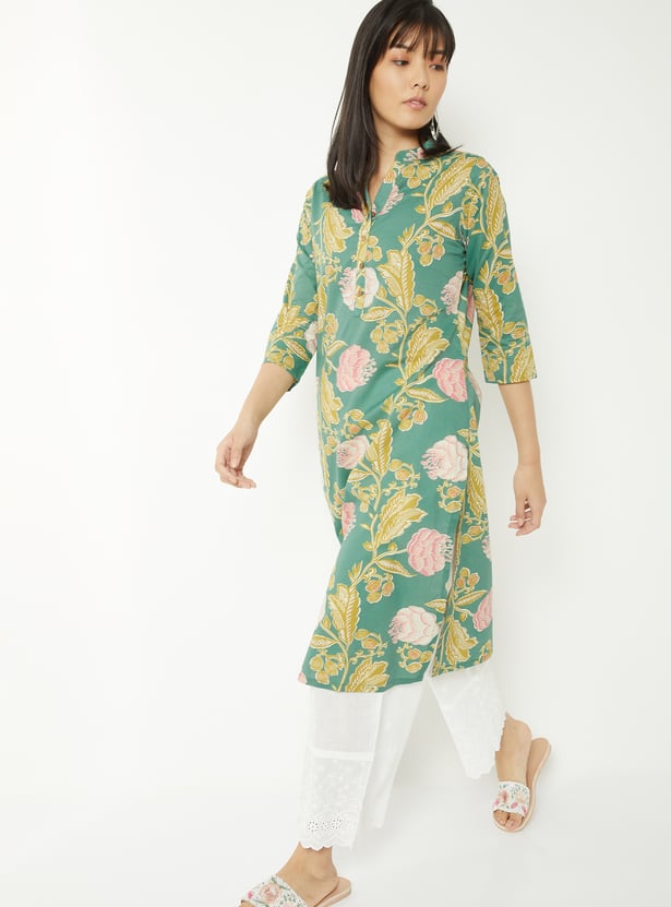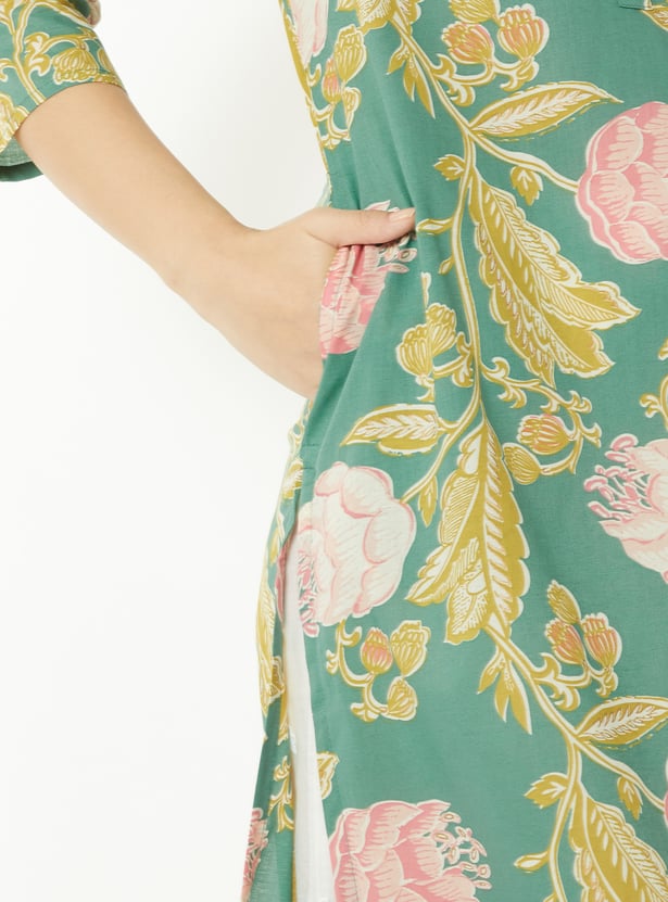 This printed straight kurta is crafted with a graceful band collar, 3/4th sleeves, and side slits for ease of movement. A practical side pocket adds functionality, while the delicate embroidery elevates its understated silhouette.