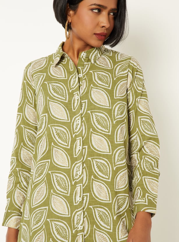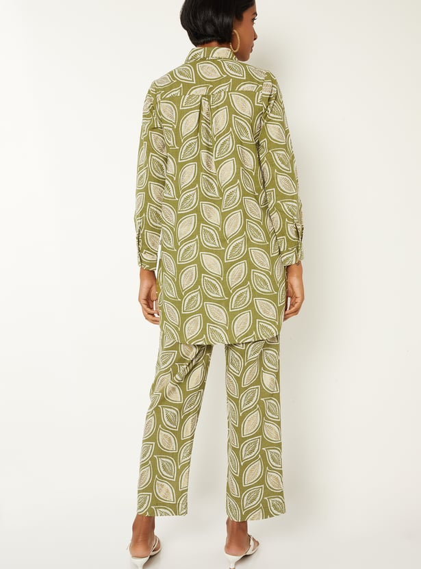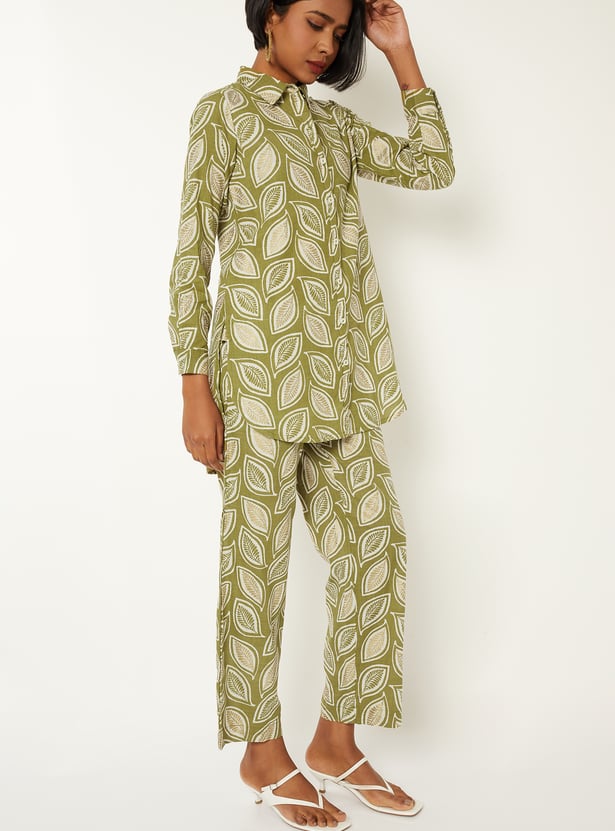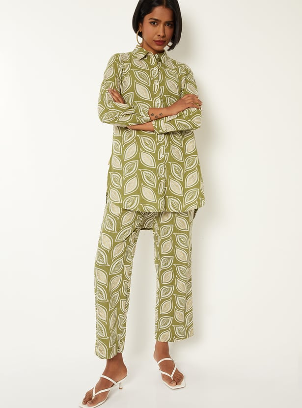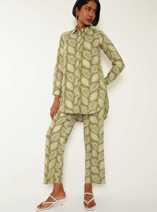 Sophisticated and stylish, this printed straight shirt-style kurti features a smart spread collar, button placket, and full sleeves with buttoned cuffs, and a high-low hem for a refined look. It’s paired with straight pants featuring side pockets and an elasticated waistband, offering all-day comfort with effortless elegance.
