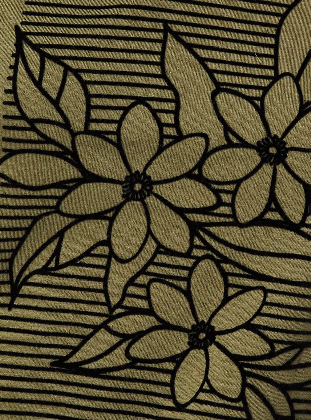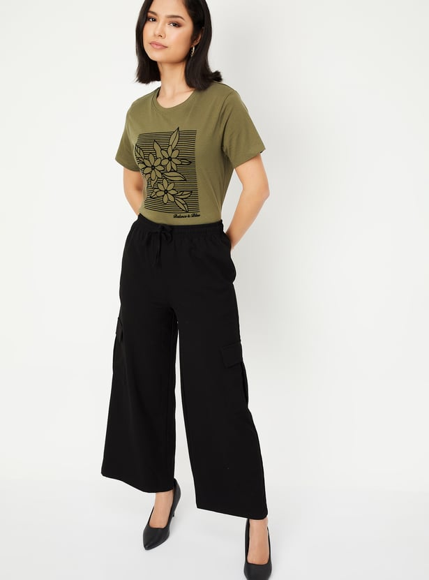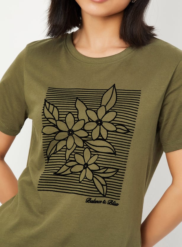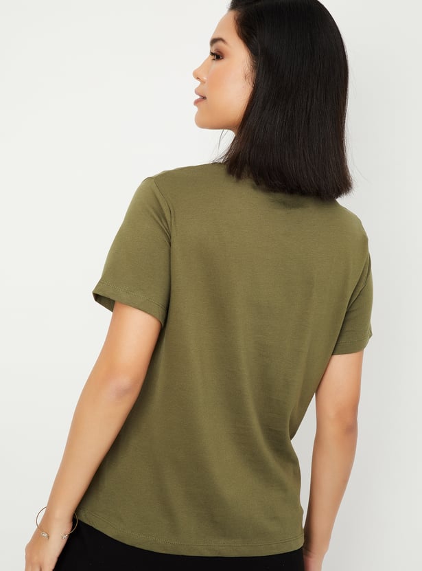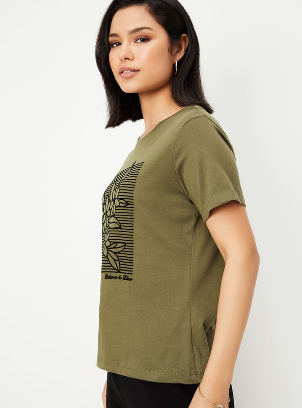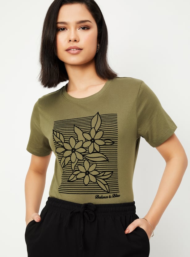 Ready to level up your casual style? This printed T-shirt for women features a trendy round neck and comfy half sleeves, perfect for those laid-back days. Model Size :