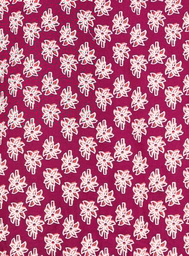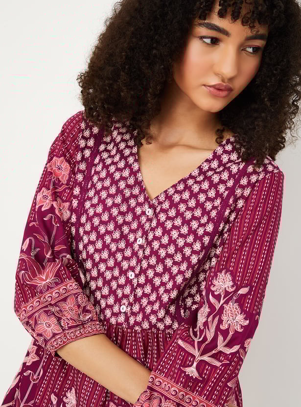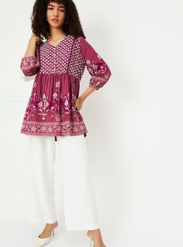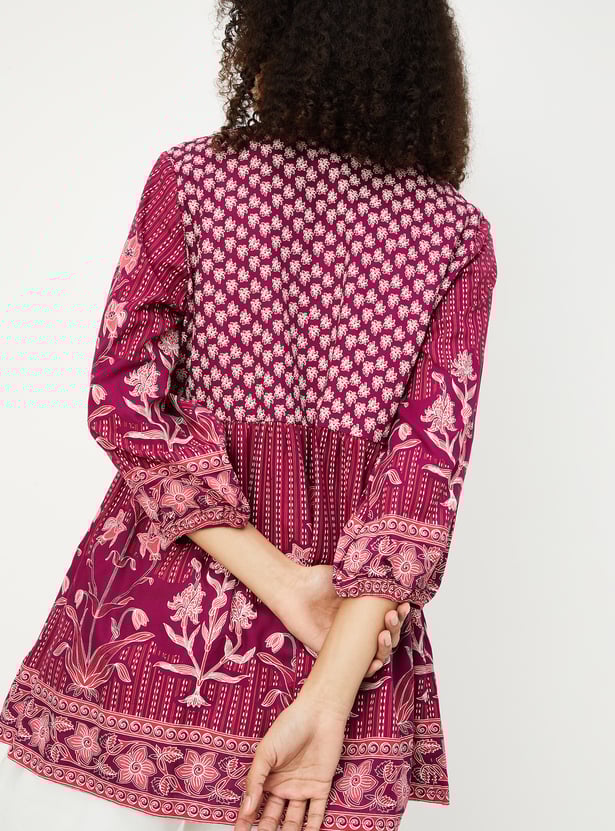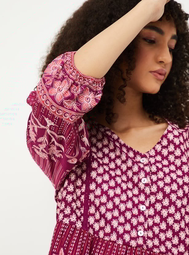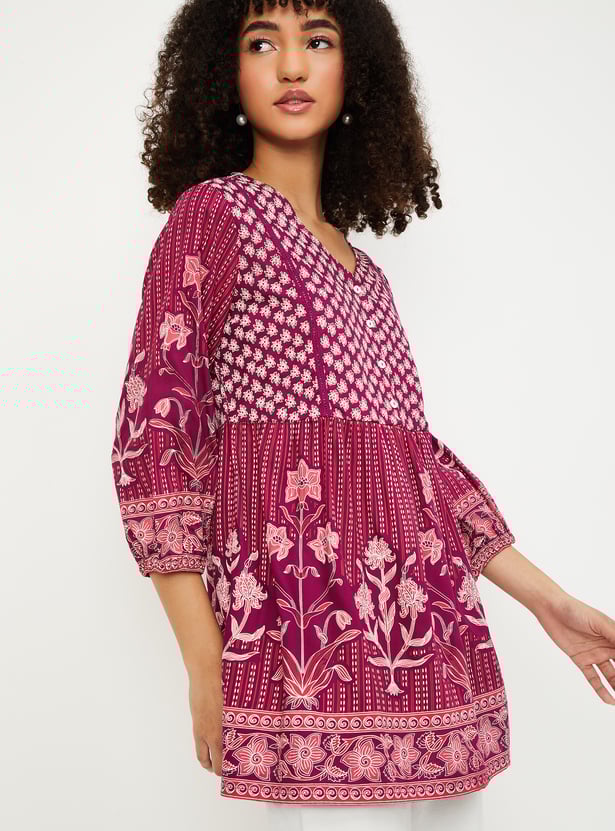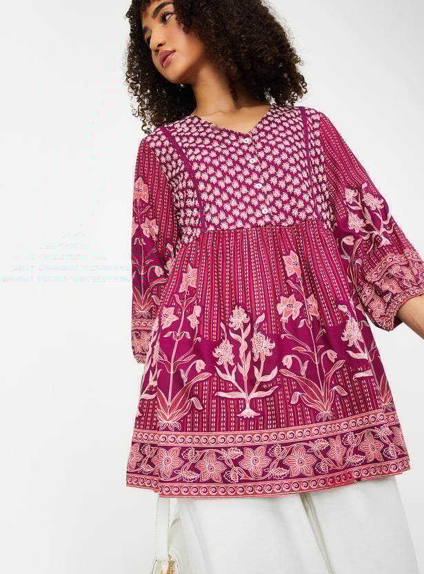 Look breezy and elegant in this tunic that is updated with floral prints. It is designed with a V-neck, three-quarter sleeves, a quarter button-down placket and a shirred waist. Style this tunic with denim shorts and wedge sandals.