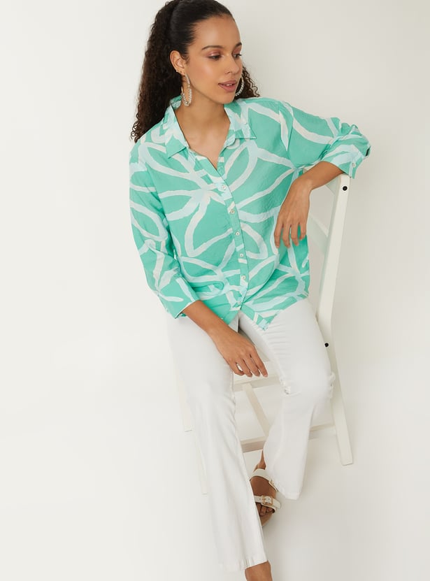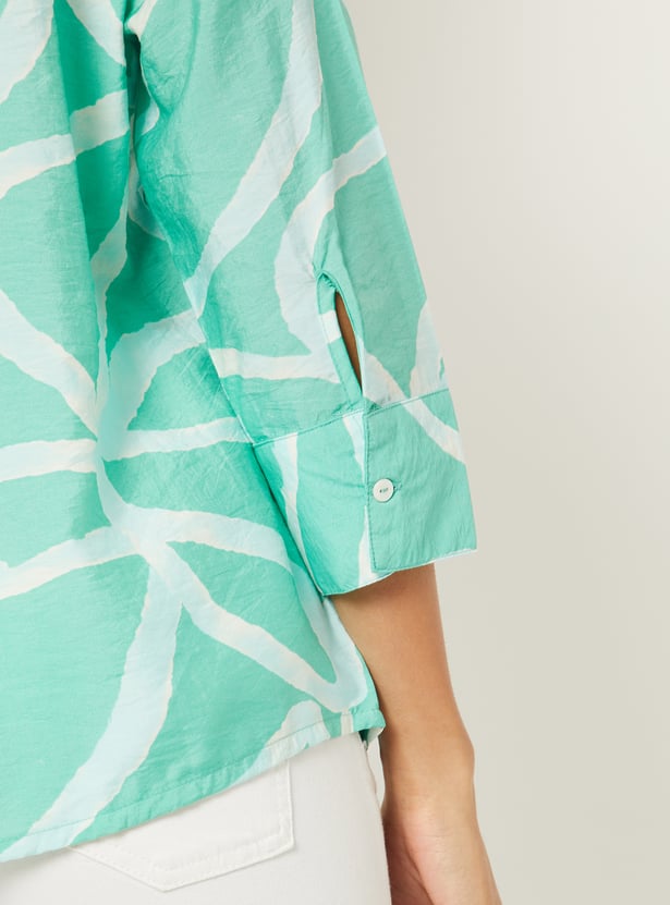 This all-over printed tunic features a classic shirt collar, button-down placket, and 3/4 cuffed sleeves. The relaxed fit makes it perfect for everyday chic style.