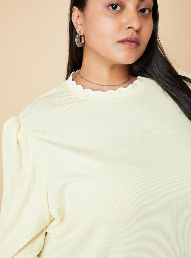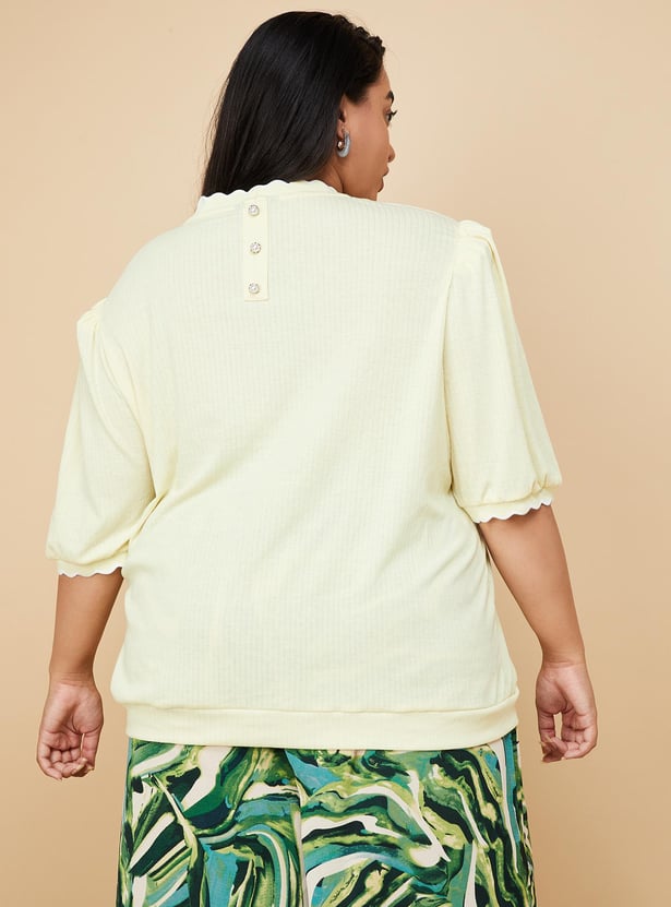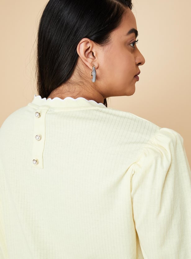 Elevate your casual wardrobe with this top, boasting a rib knit finish for added texture. Featuring a mock neckline and puffed sleeves with a scalloped hem, it's a stylish addition to any outfit.