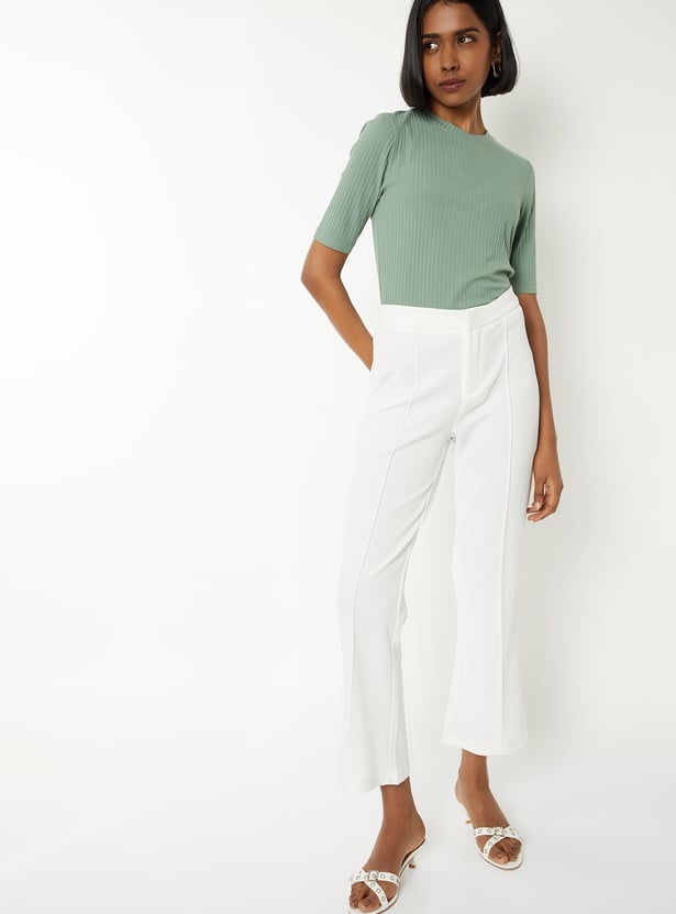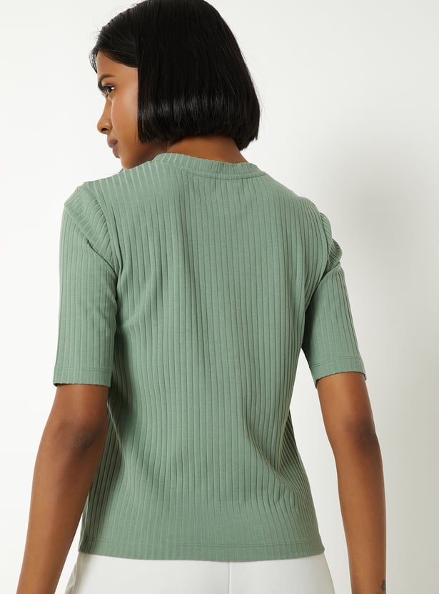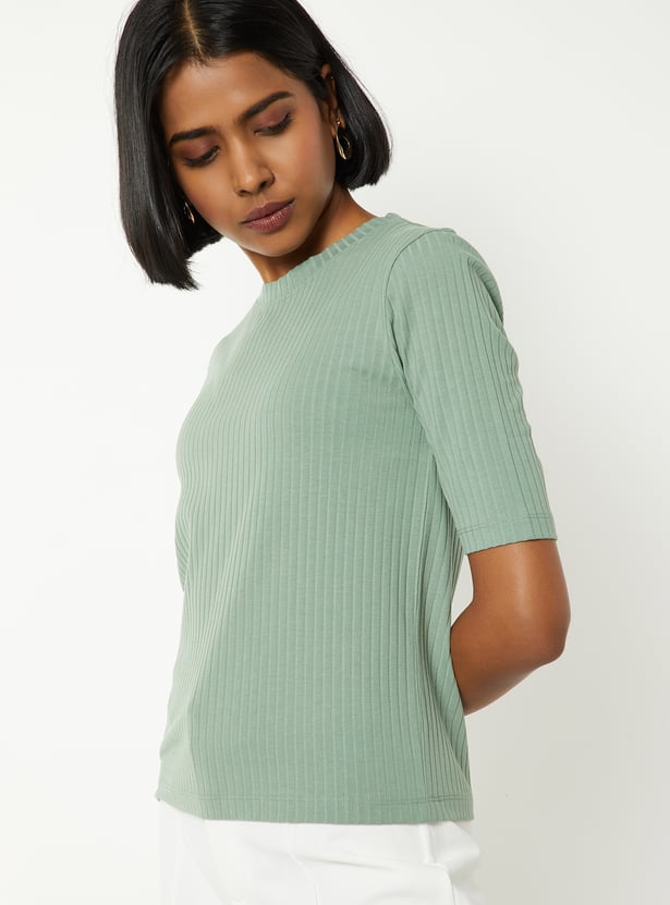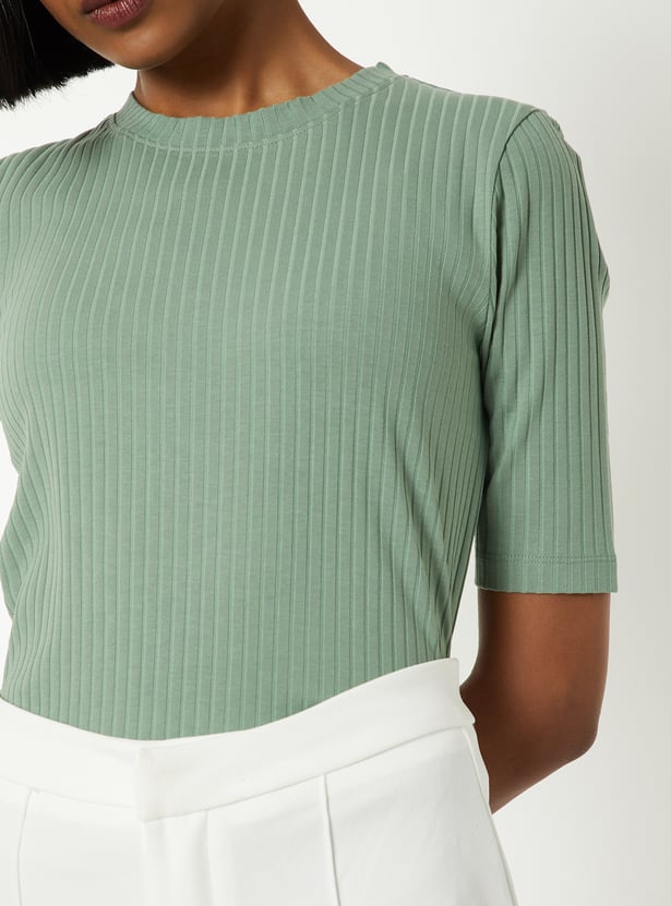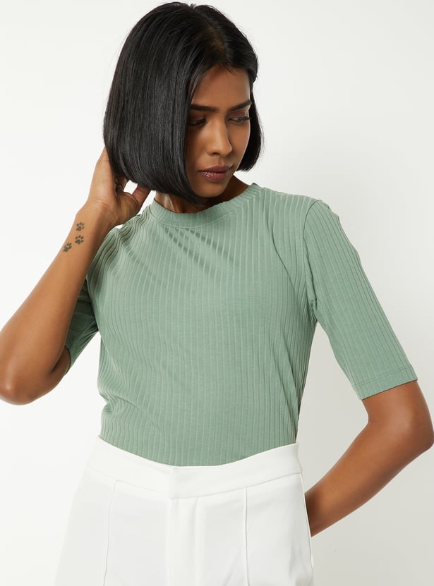 Upgrade your basics with this ribbed T-shirt for women, featuring a soft round neck and half sleeves for a flattering, easy fit. The ribbed texture adds subtle sophistication, making it perfect for layering or wearing solo—ideal for workdays, coffee dates, or relaxed weekends. Model Size :