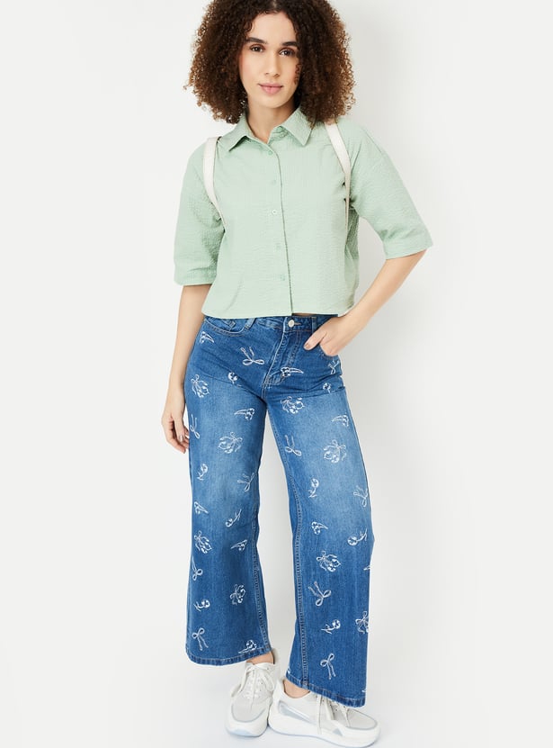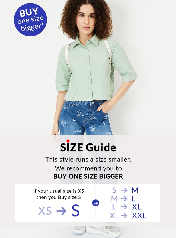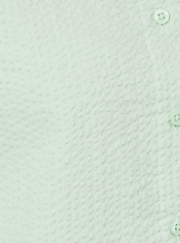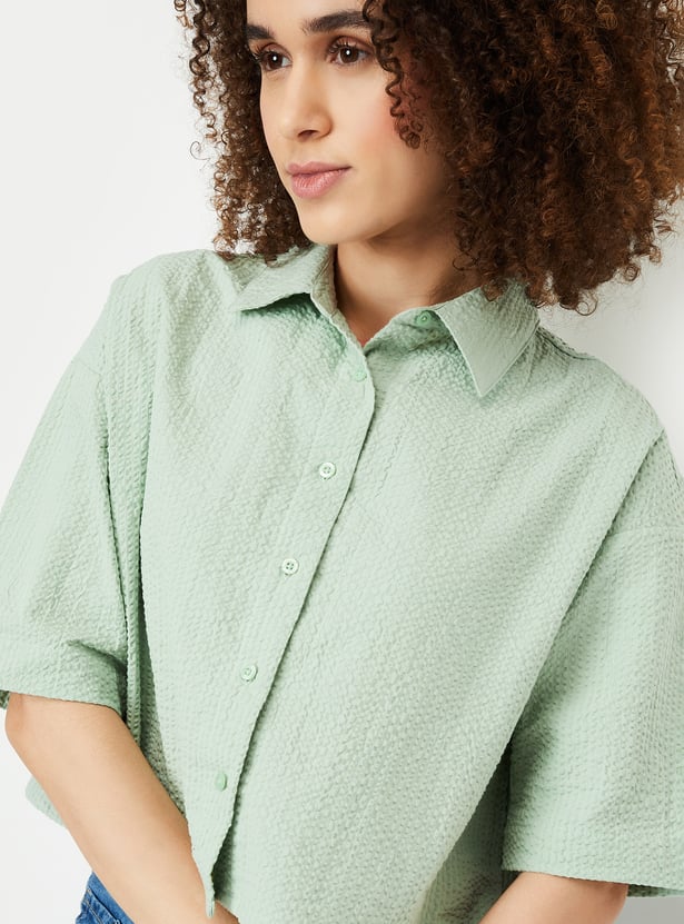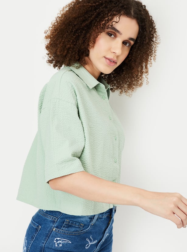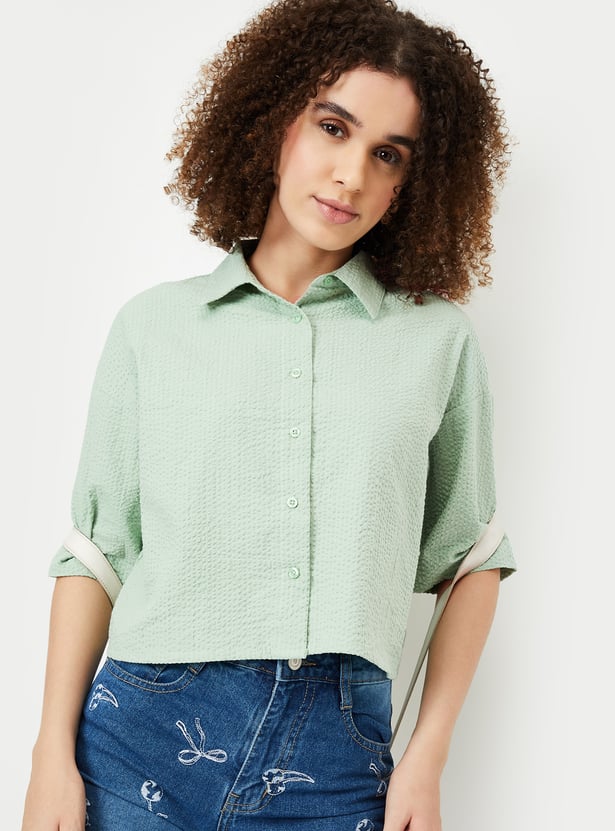 Elevate your wardrobe with this seersucker cropped shirt, designed with a spread collar and half sleeves for a touch of elegance. The lightweight seersucker fabric and trendy cropped silhouette make it a perfect choice for casual outings or warm-weather styling.