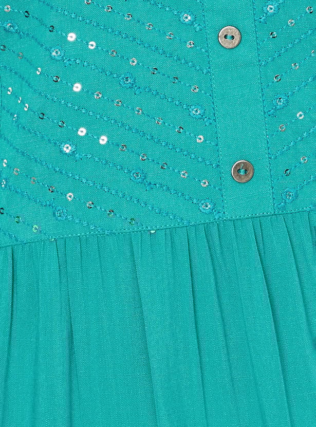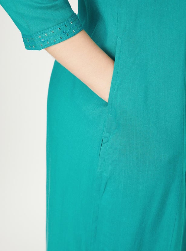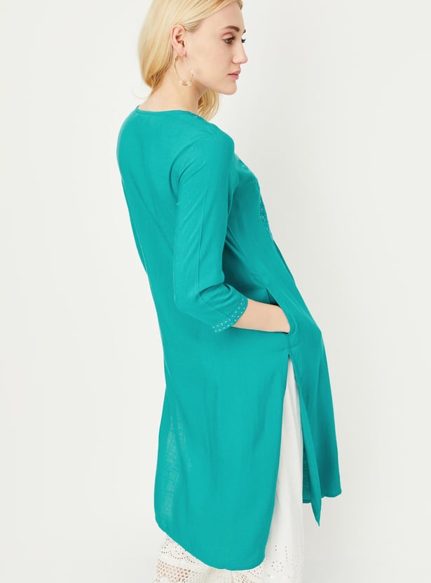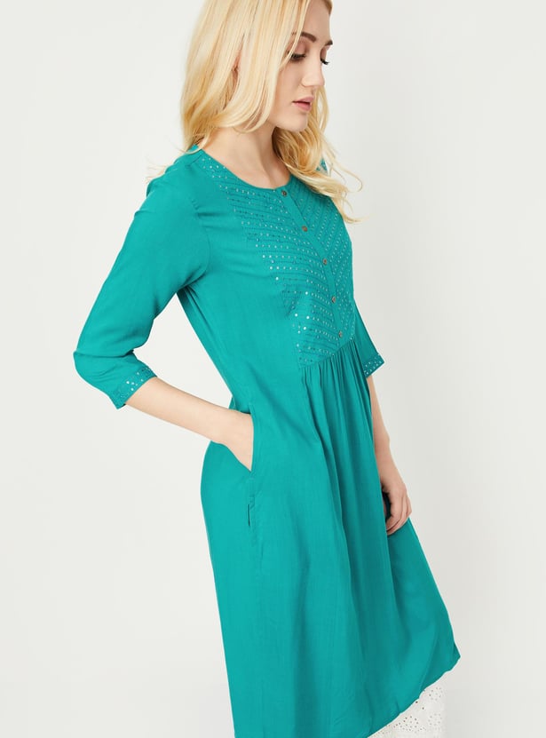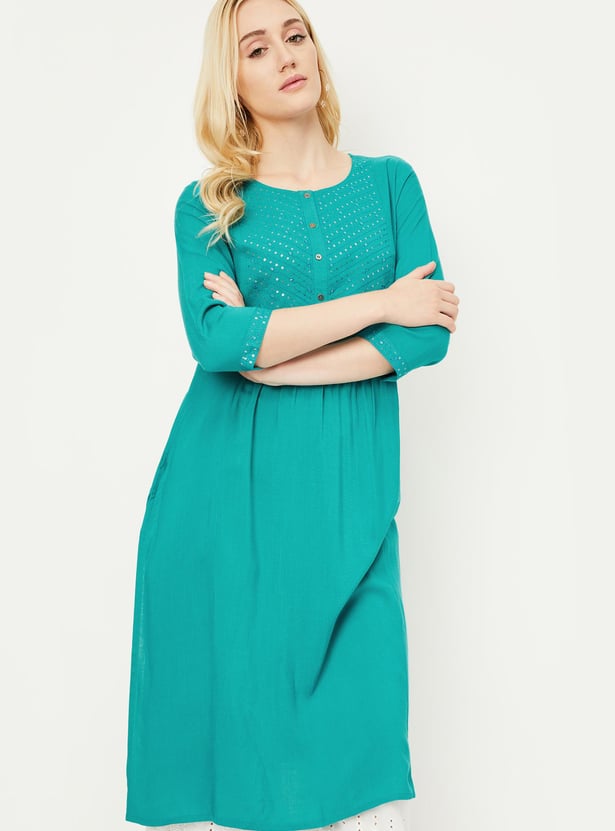 Jazz up your casual styling with this straight kurta. It features a round neck, sequinned detail at the yoke, three-quarter sleeves, a gathered waist, and a side pocket.