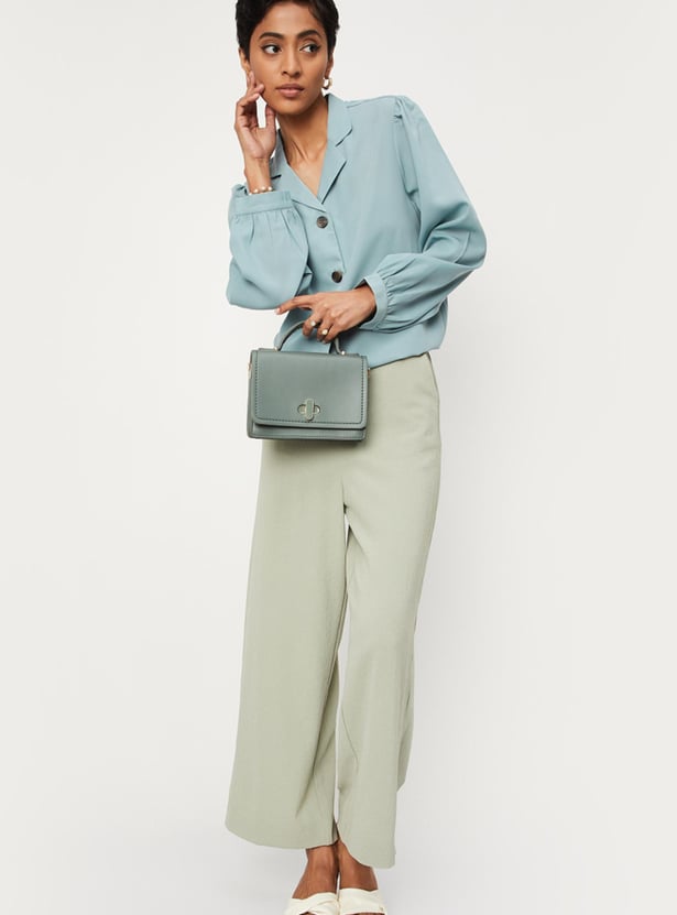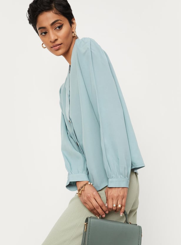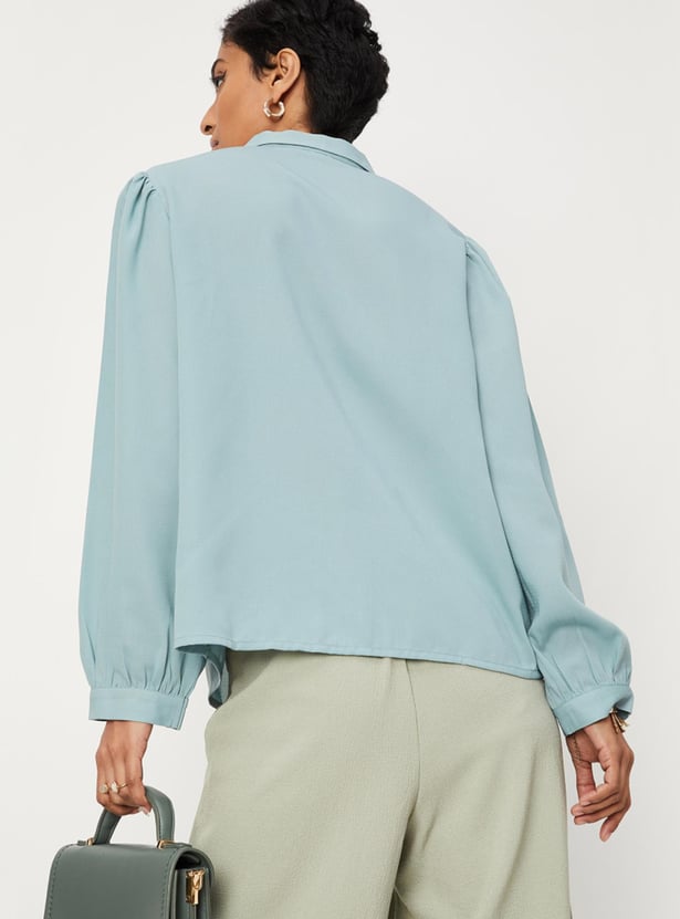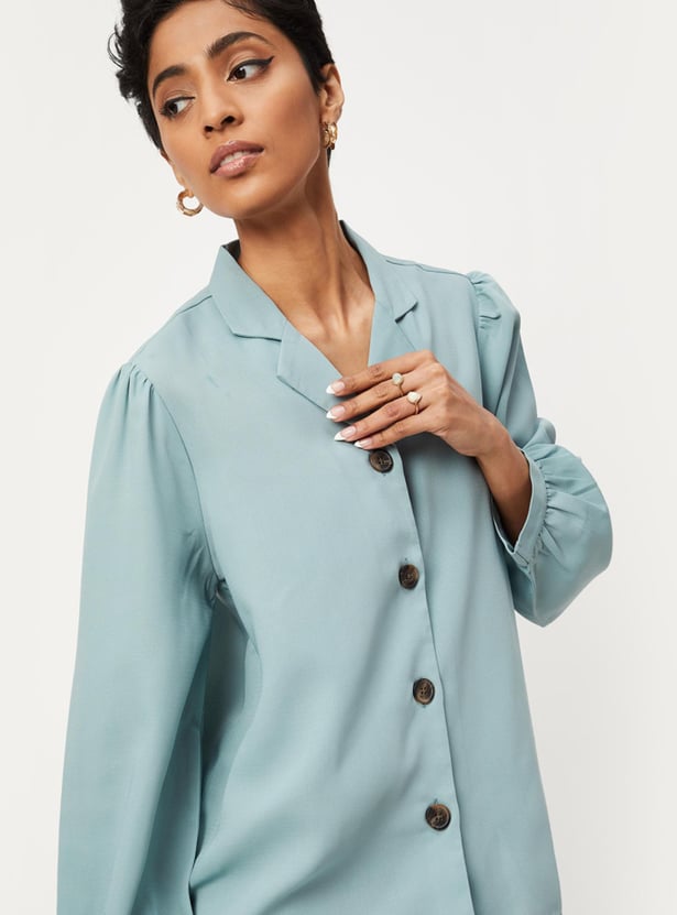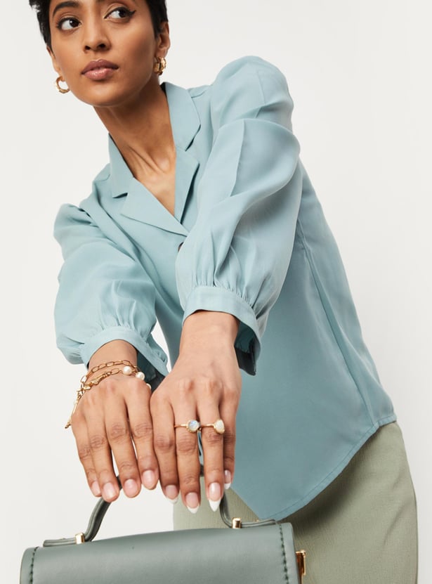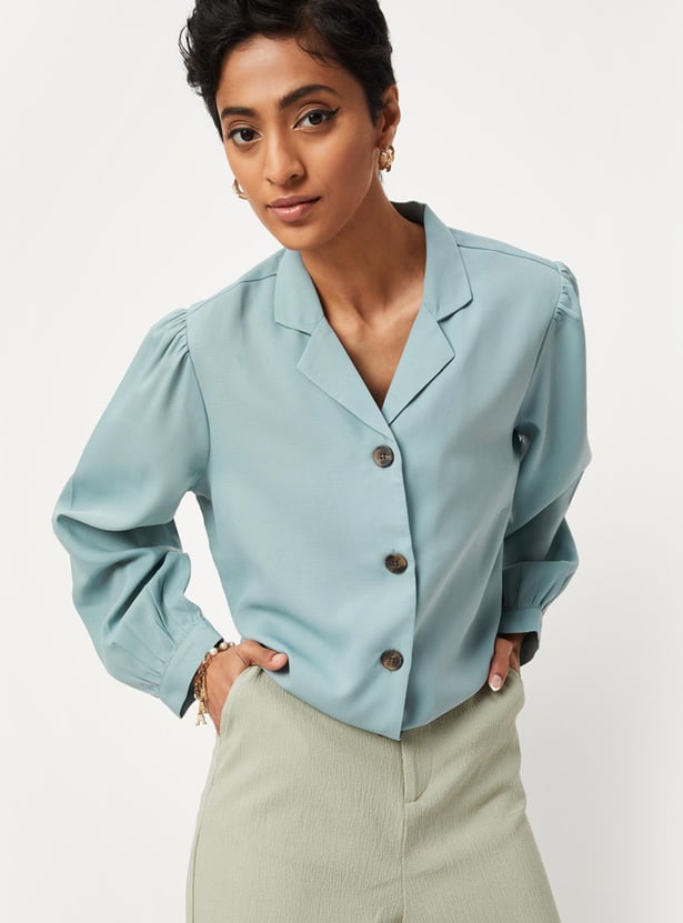 Nothing says sophistication like this semi-formal shirt. It is rendered in a solid tone with a notched collar, puffed sleeves, and a button placket. Complete the look by tucking in this shirt in a pair of tailored trousers and teaming it up with pumps.