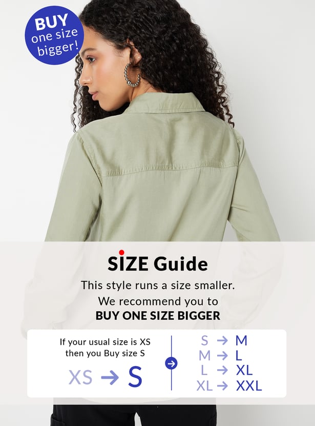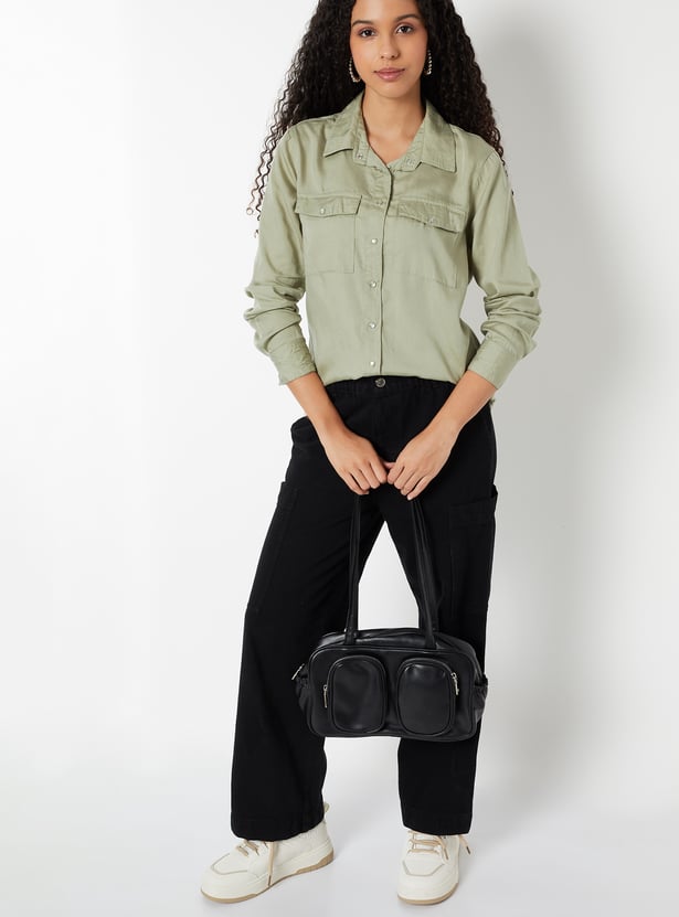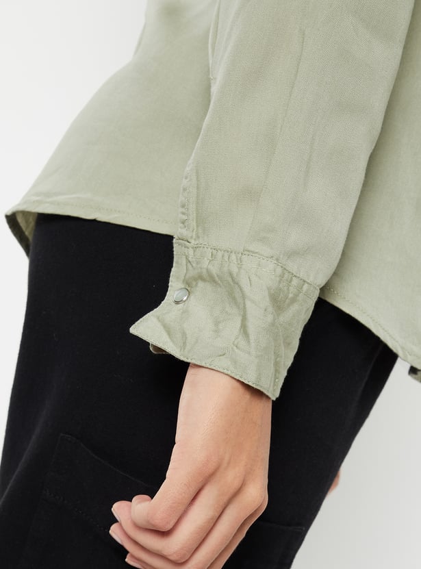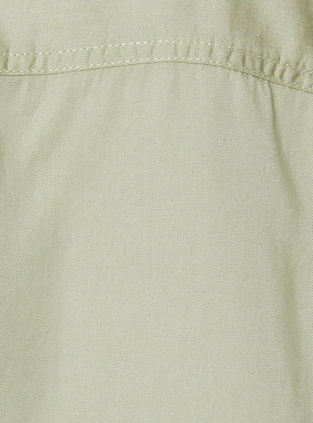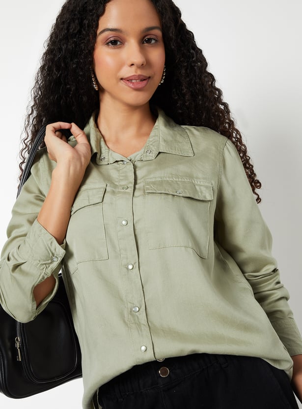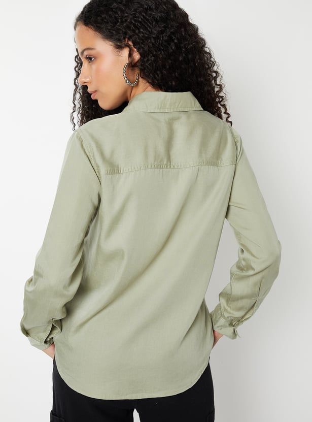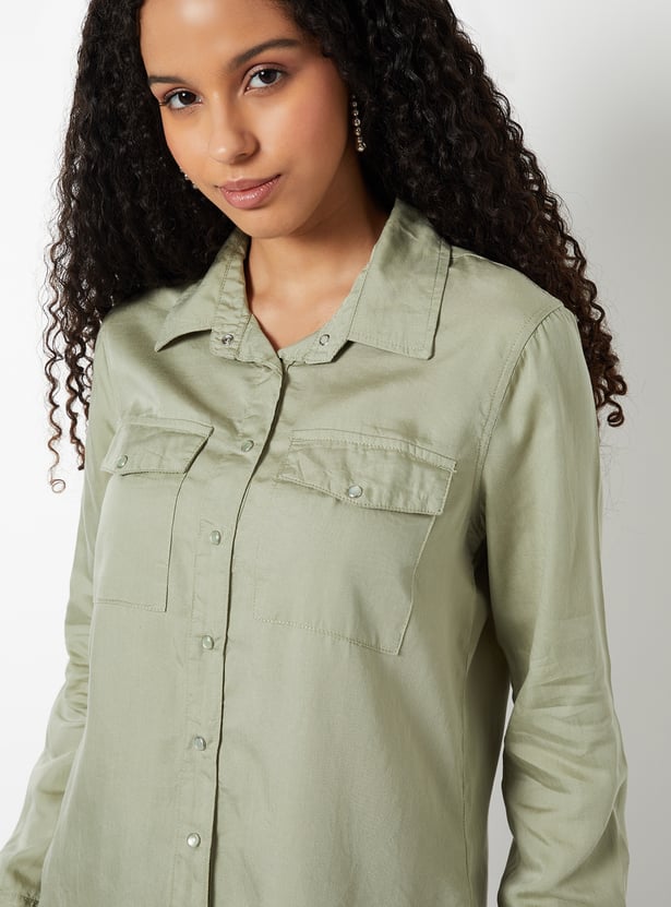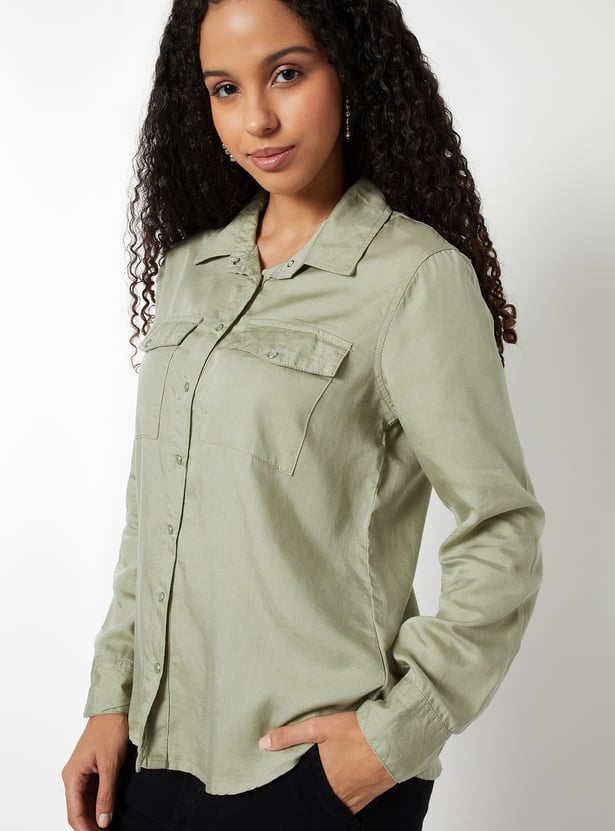 Stay polished in this solid regular fit shirt, featuring a spread collar, button placket, full sleeves with button cuffs, and flap pockets for added style. Perfect for both casual and semi-formal occasions.