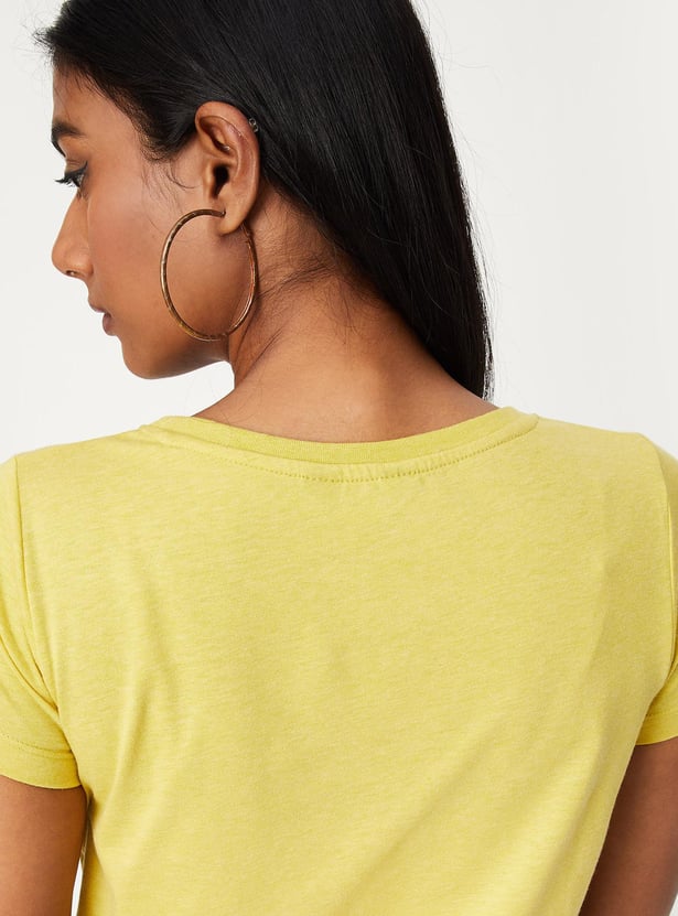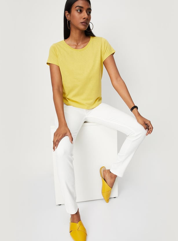 Let your style speak for yourself with this t-shirt. It comes with a solid surface, half sleeves, and a round neckline. Team it up with a pair of jeans and flat sandals to complete the look.