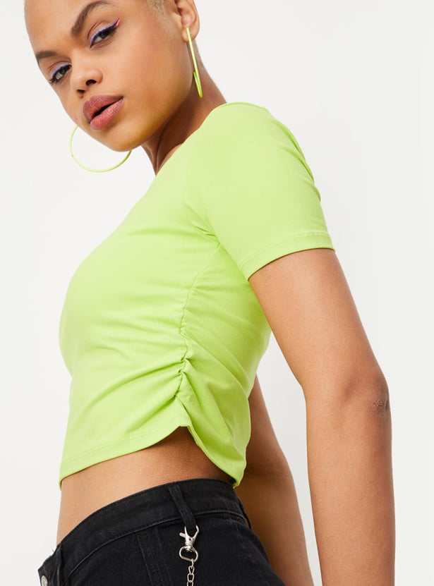 A wardrobe staple, this T-shirt is crafted in a cropped profile. It is rendered in a solid tone with a square neckline and short sleeves. Style this tee with jeans and sneakers for a casual day look.