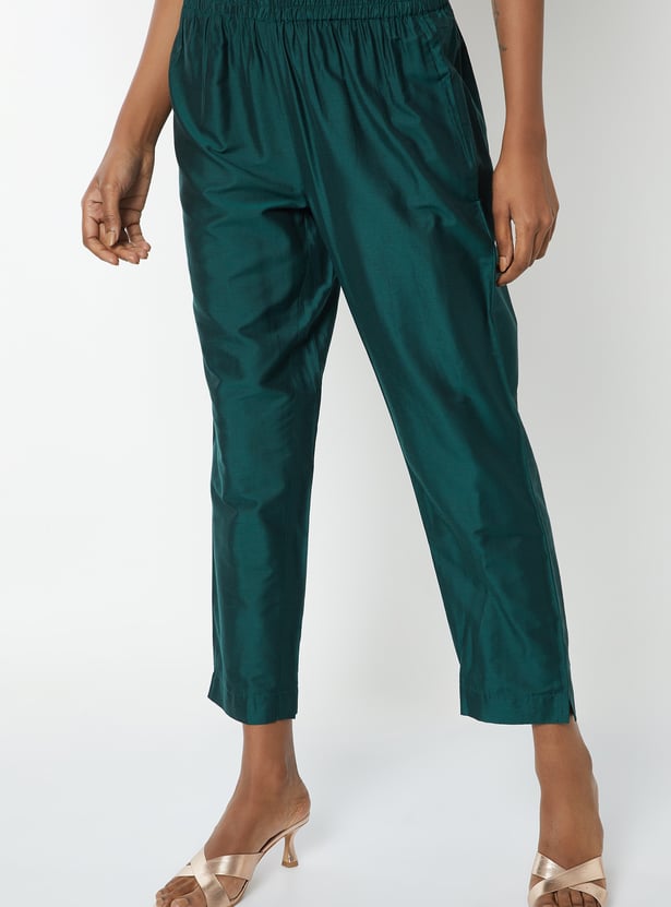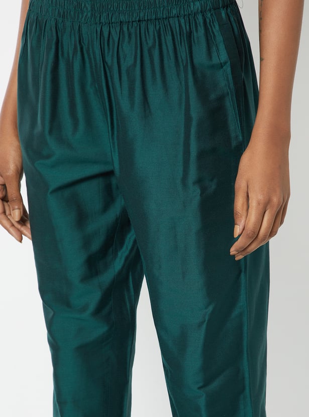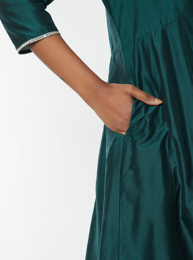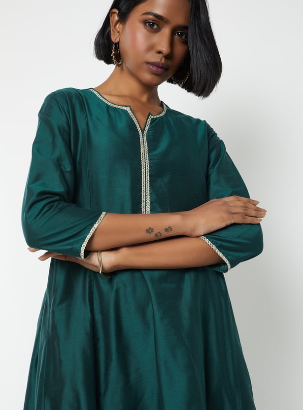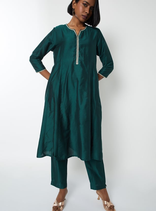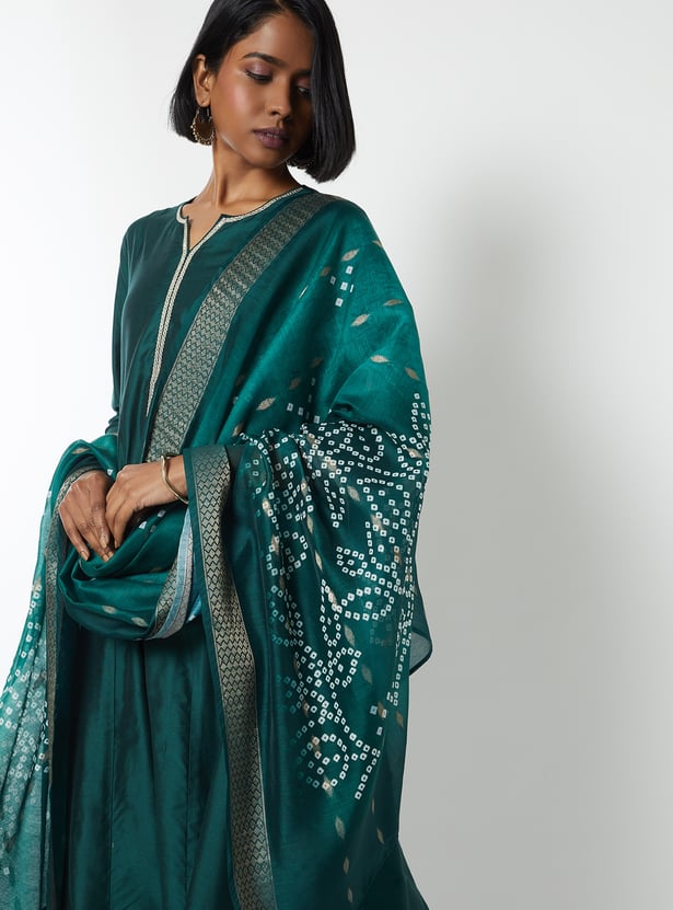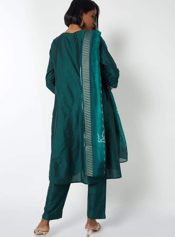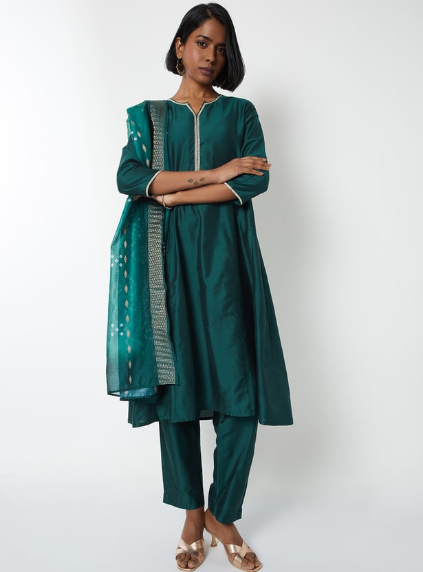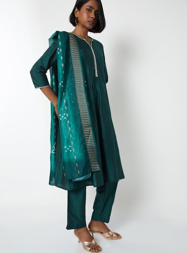 This solid straight kurta set features a notch neck, 3/4th sleeves, and side slits for a clean, elegant silhouette. Paired with straight pants and a printed dupatta, it offers a perfect mix of simplicity and charm.