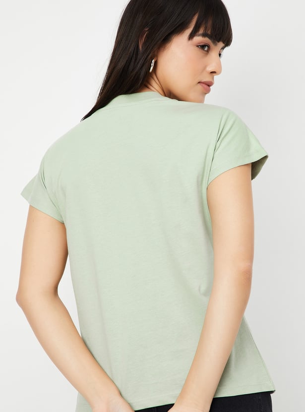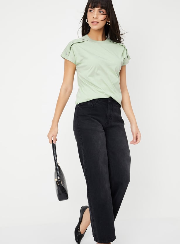 Stay effortlessly chic with this solid top, designed for a timeless look. The button tabs over the shoulder add a stylish touch, while the round neck and half sleeves provide a comfortable fit for all-day wear.