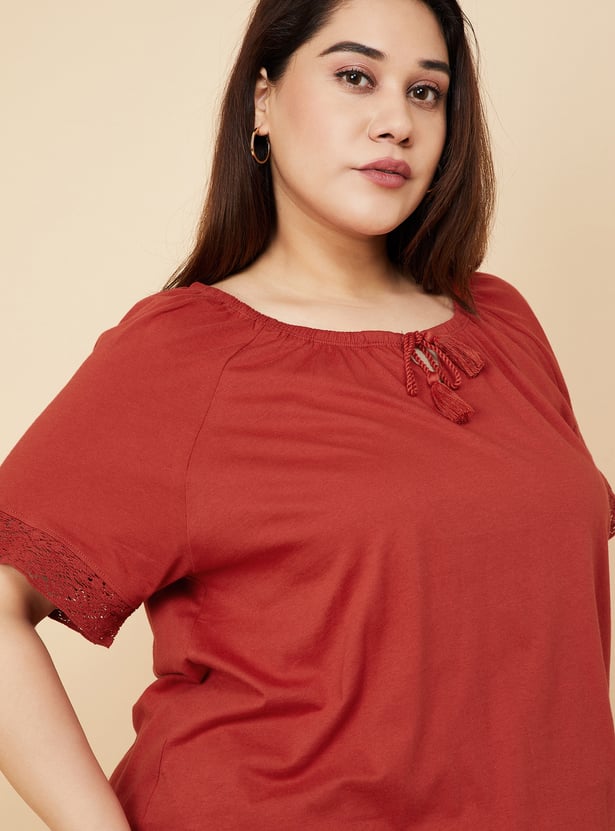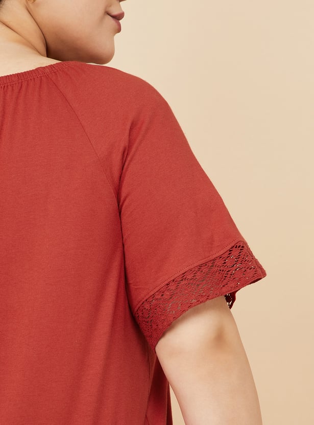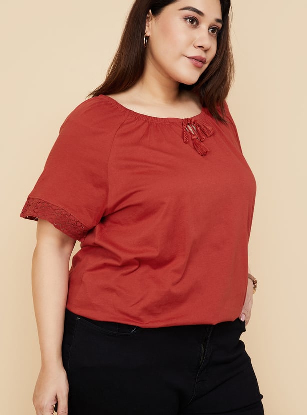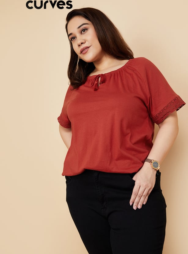 Add some style to your everyday wardrobe with this chic top. It features a classic tie-up neck, half sleeves with lace, and an elasticated hem.